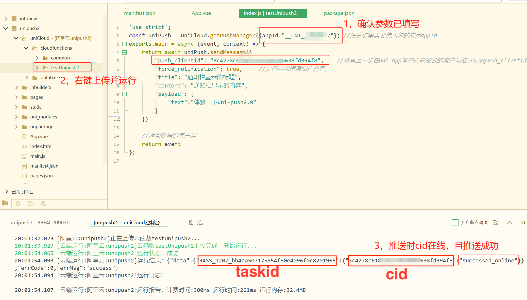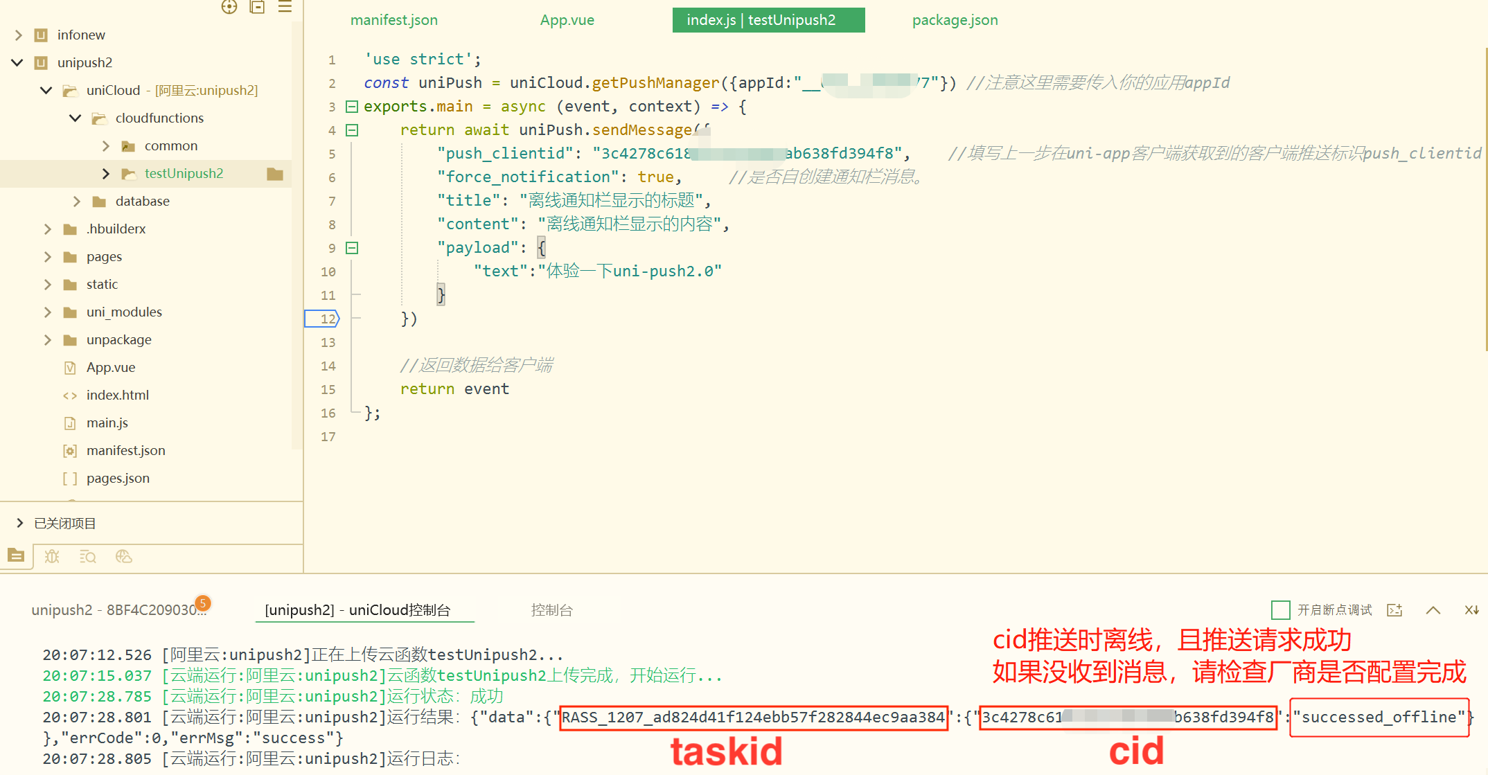 启动 app 后成功获取 cid 则说明云打包 “在线推送” 成功,支持在线推送。