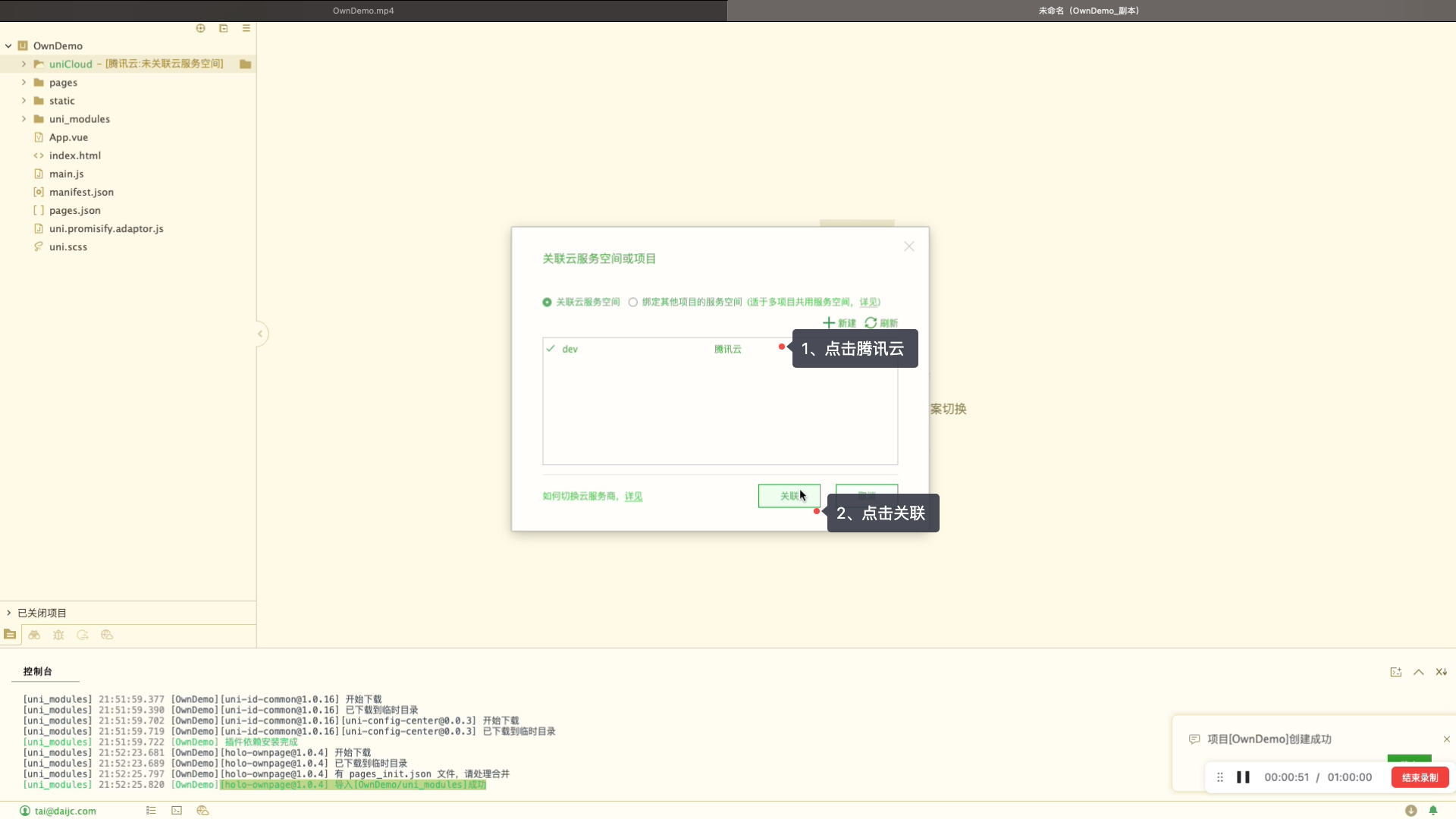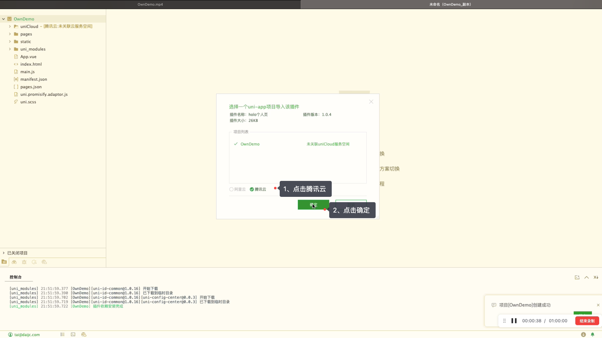 操作视频:私信qa@hlszh.com 一、新建uniCloud项目,选择腾讯云 二、从插件市场导入至HbuilderX 三、在HBuilderX点击腾讯云导入 四、选择pages,注册 五、关联云服务空间 六、上传DB Schema文件至云服务空间 七、运行查看效果 选择uni_modules/holo-ownpage/pages/holo-ownpage文件; 选择云端云函数; 运行。 页面模板地址:Holo个人页