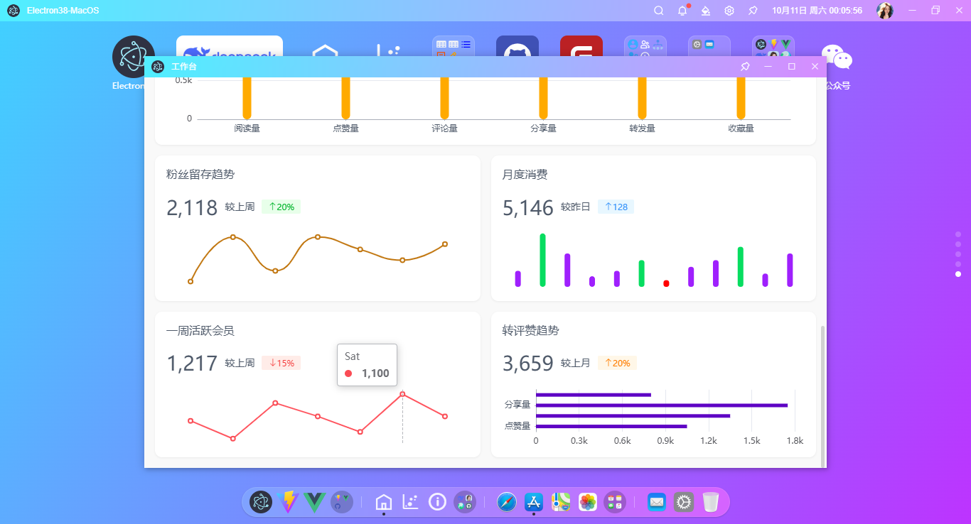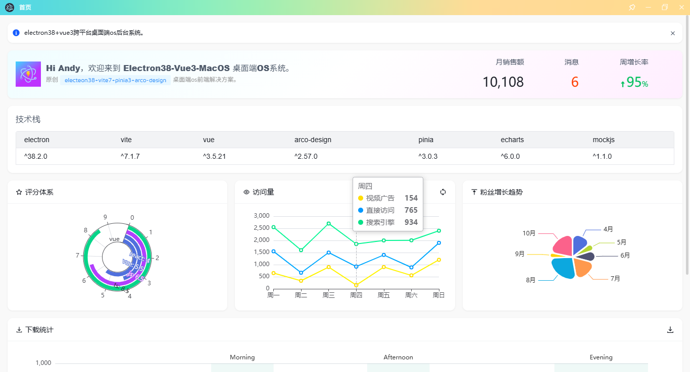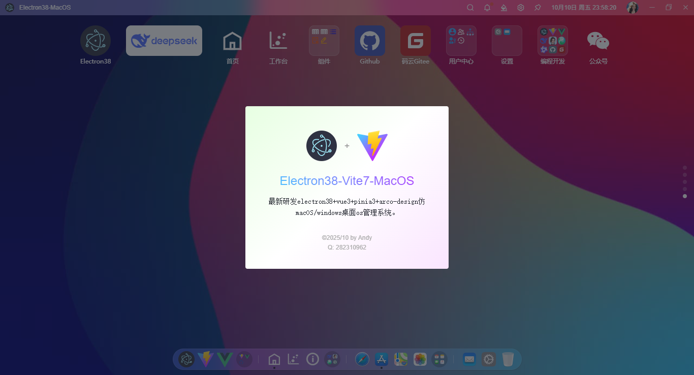 vue3-electron38-os:最新原创vite7.1+electron38.2+vue3 setup+pinia3+arcoDesign+echarts跨平台仿macOS/windows风格桌面os管理系统模板。自研可拖拽栅格布局结构、自定义JSON配置桌面菜单/Dock菜单。