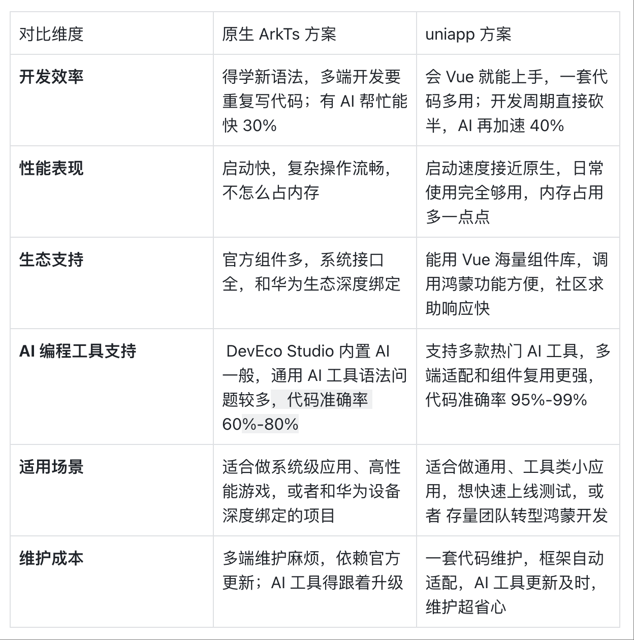 正好 2025 年鸿蒙推出了开发者激励计划,不管你选原生 ArkTs 方案,还是 uniapp 方案,都有机会拿奖励。原生 ArkTs 适合深度挖掘鸿蒙功能,把应用性能拉满;uniapp 更擅长多端适配,开发效率高。要是搭配 AI 工具,两种方案都能事半功倍,大家可以根据自己的需求和激励计划的扶持方向来选。