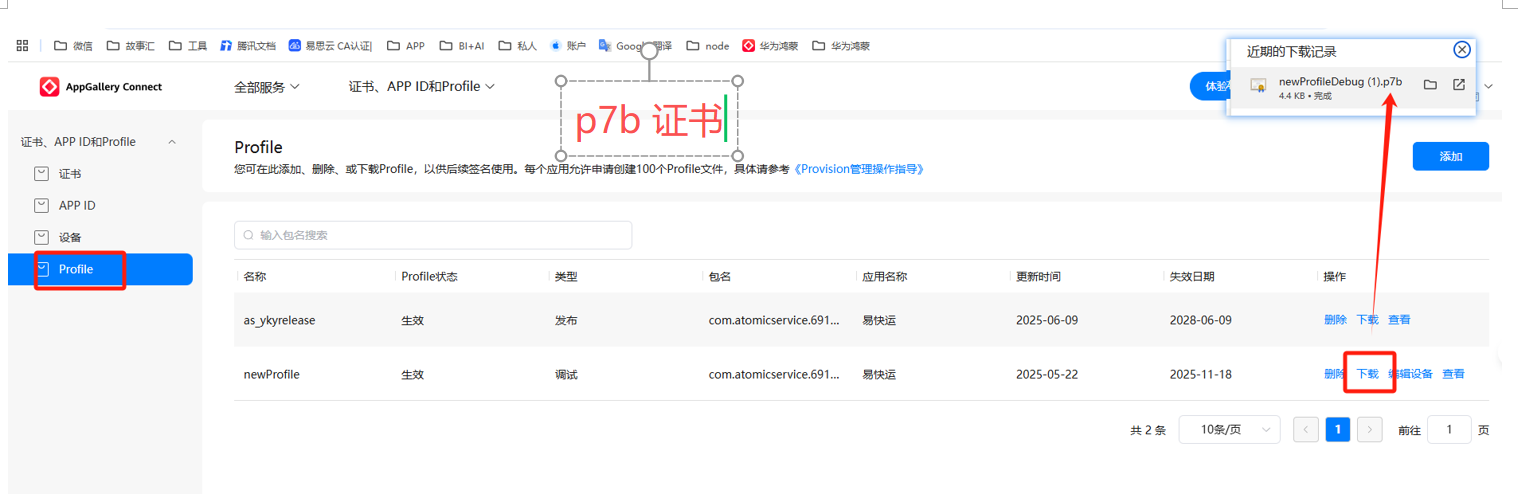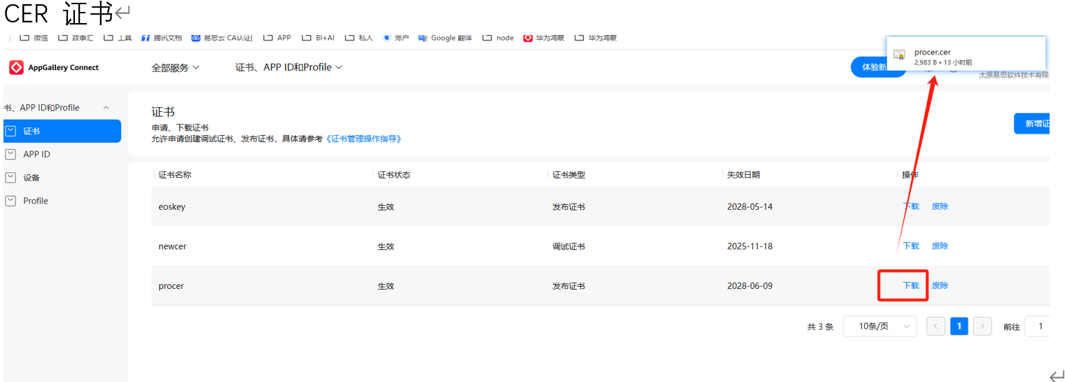 - cer:打开AGC平台需要登陆华为账号进行申请。在证书、APPID 和Profile菜单下操作,需要区分开发和生产证书类型。