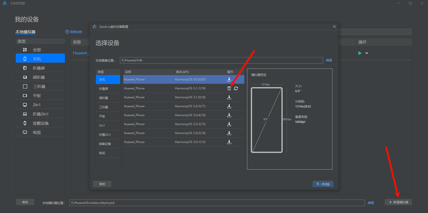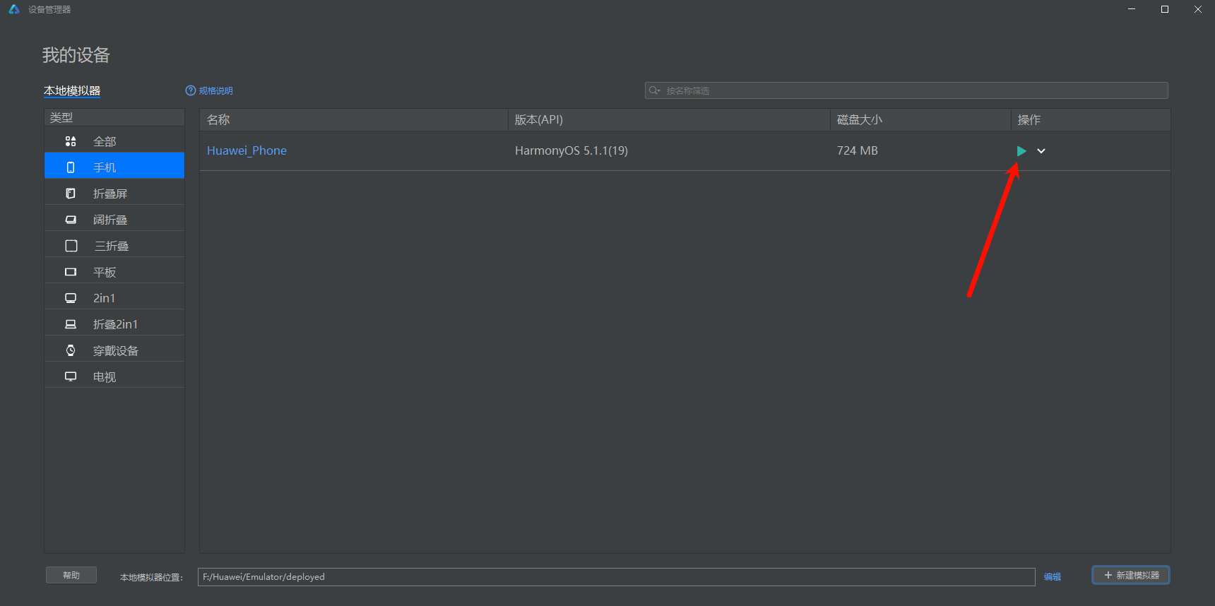 在上述环节中,你已经下载好了一个模拟器,此时可在 DevEco Studio 的【设备管理器】中启动模拟器。