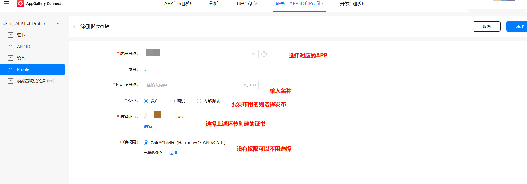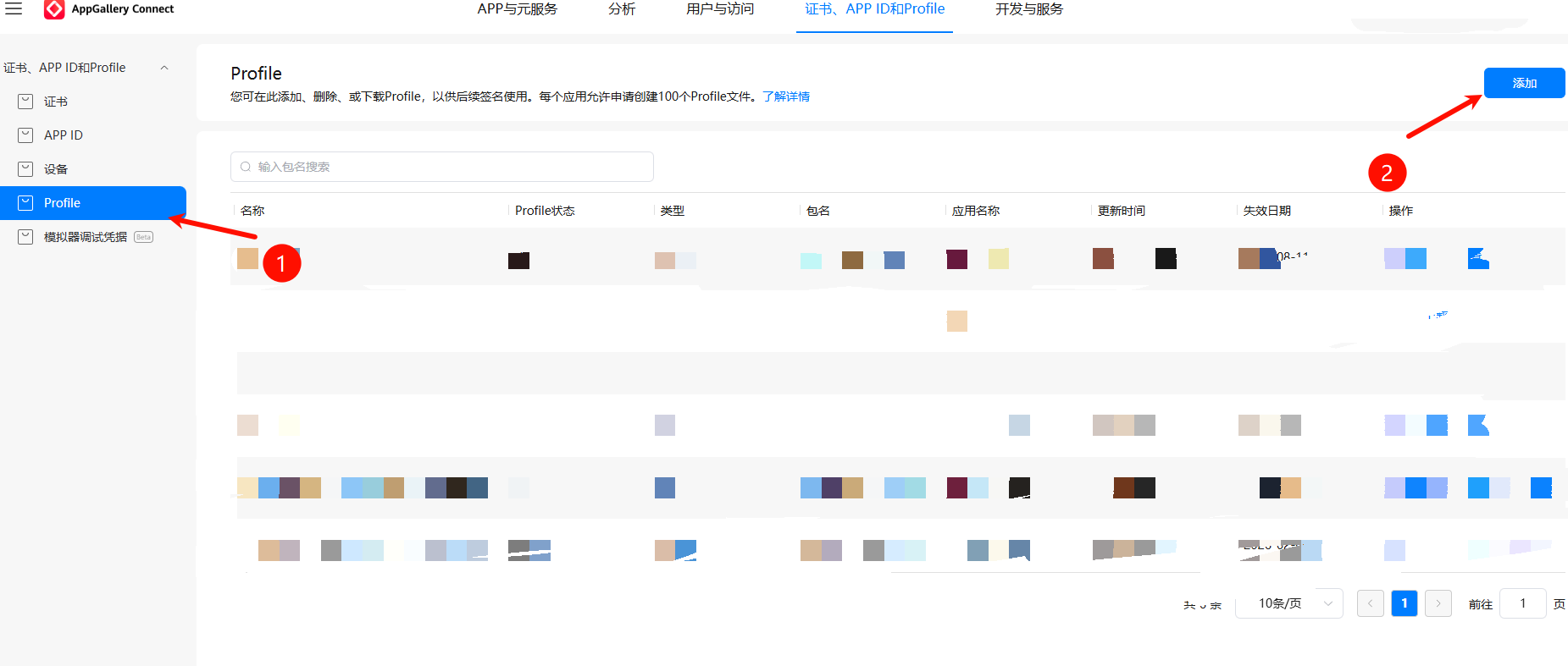 - 华为 AGC 平台,【证书、APP ID 和 Profile】→【Profile】选择【添加】。