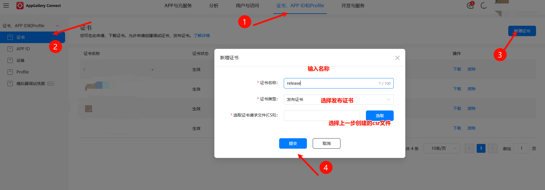 - 华为 AGC 平台,【证书、APP ID 和 Profile】→【证书】选择【新增证书】。