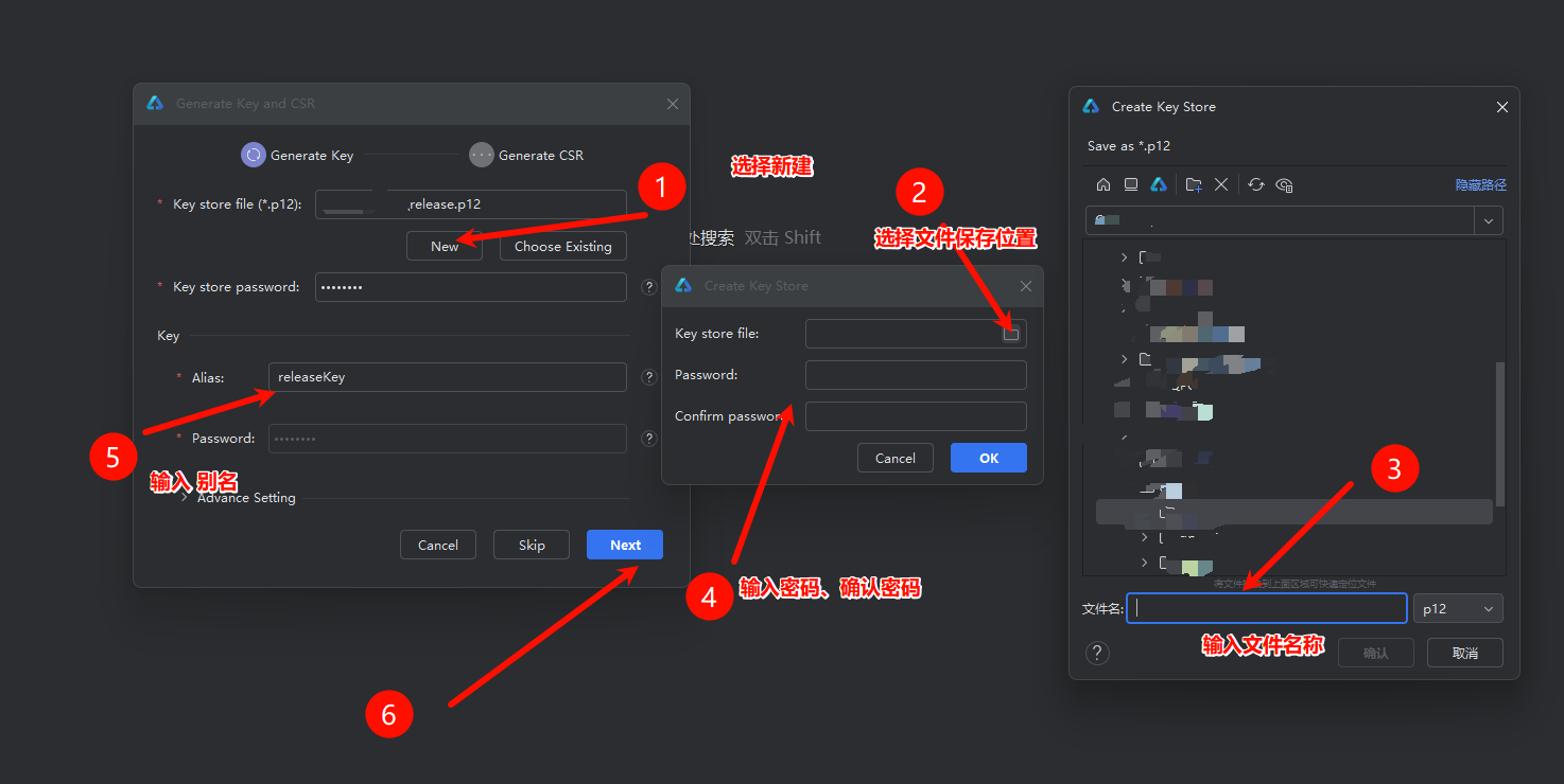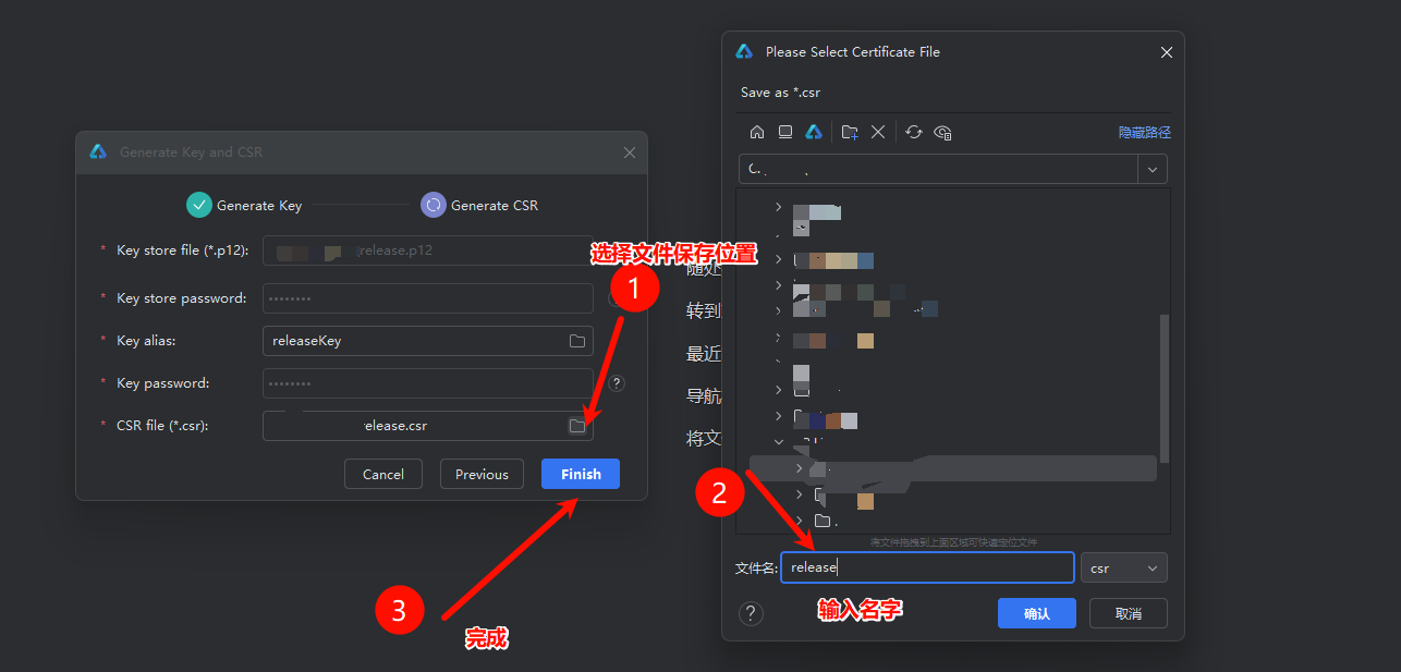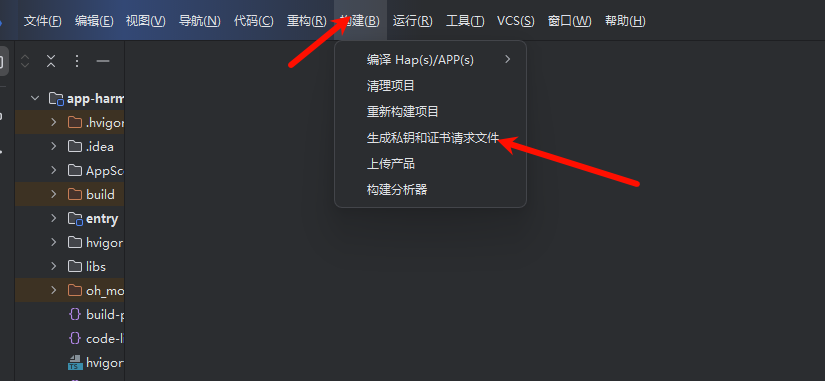 - 打开 DevEco Studio,点击【构建】→【生成私钥和证书请求文件】,在弹窗中按照提示填写信息。