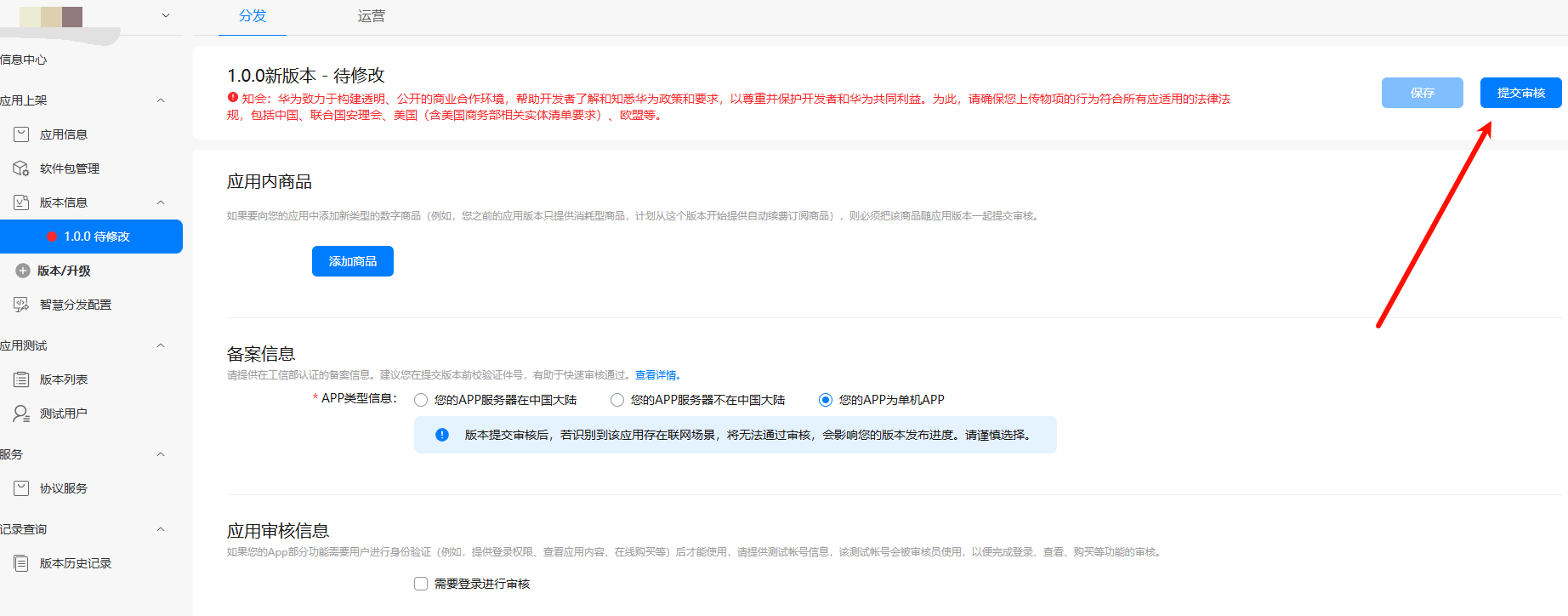 - 【版本信息】填写相关的版本信息,其中这一步的隐私政策可以使用华为托管。