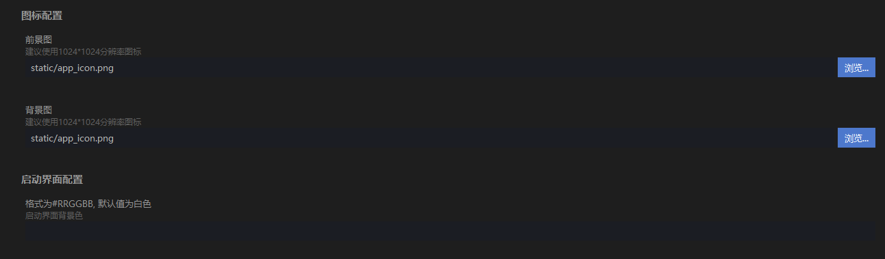 - 需要准备一个或两个 1024 * 1024 的图标用于配置 前景图 背景图 启动界面中部图标