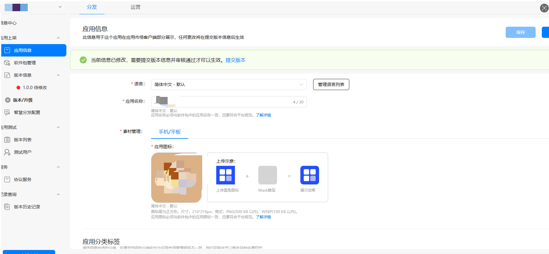 - 【应用信息】中填写相关的应用信息,刚才准备的216*216的图标在这一步中上传。