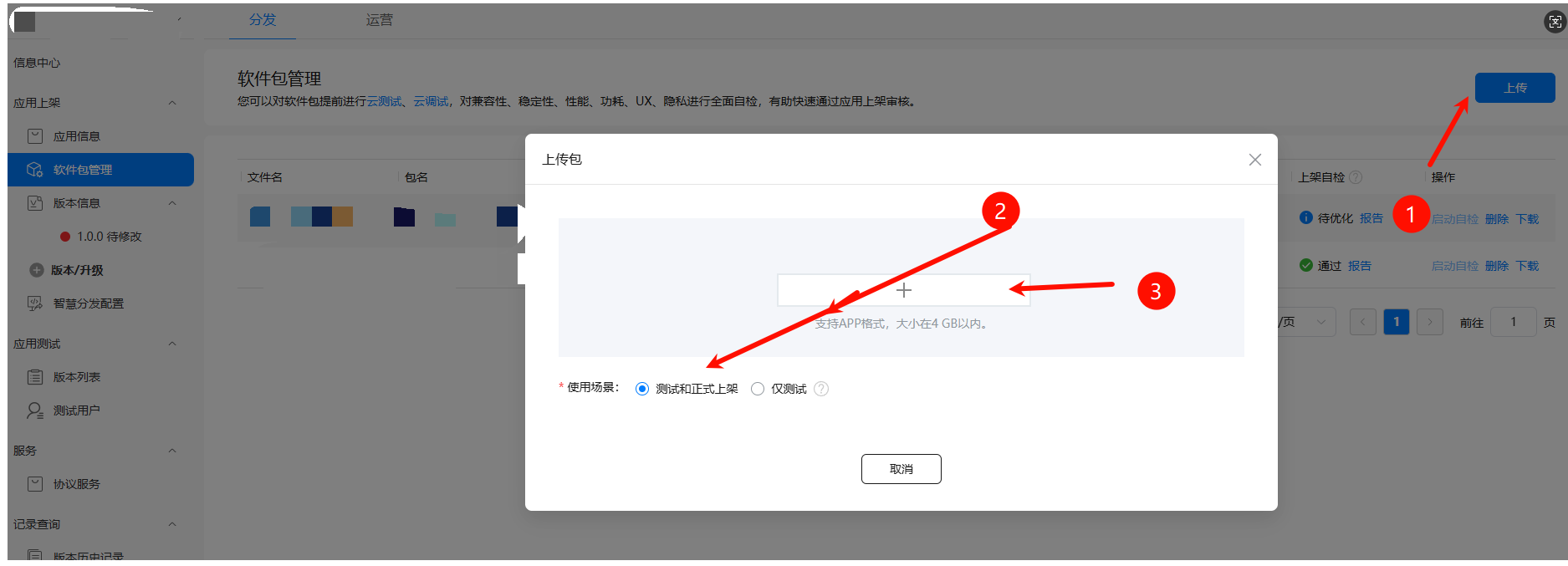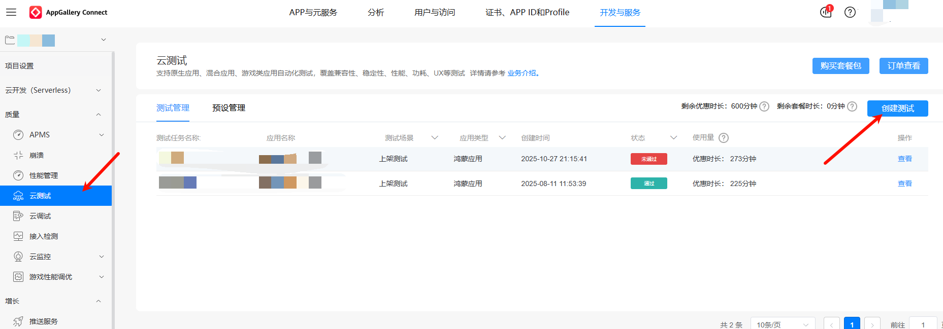 - 华为 AGC 平台,【开发与服务】→【质量】—>【云测试】->【创建测试】——>根据要求填写相关的信息