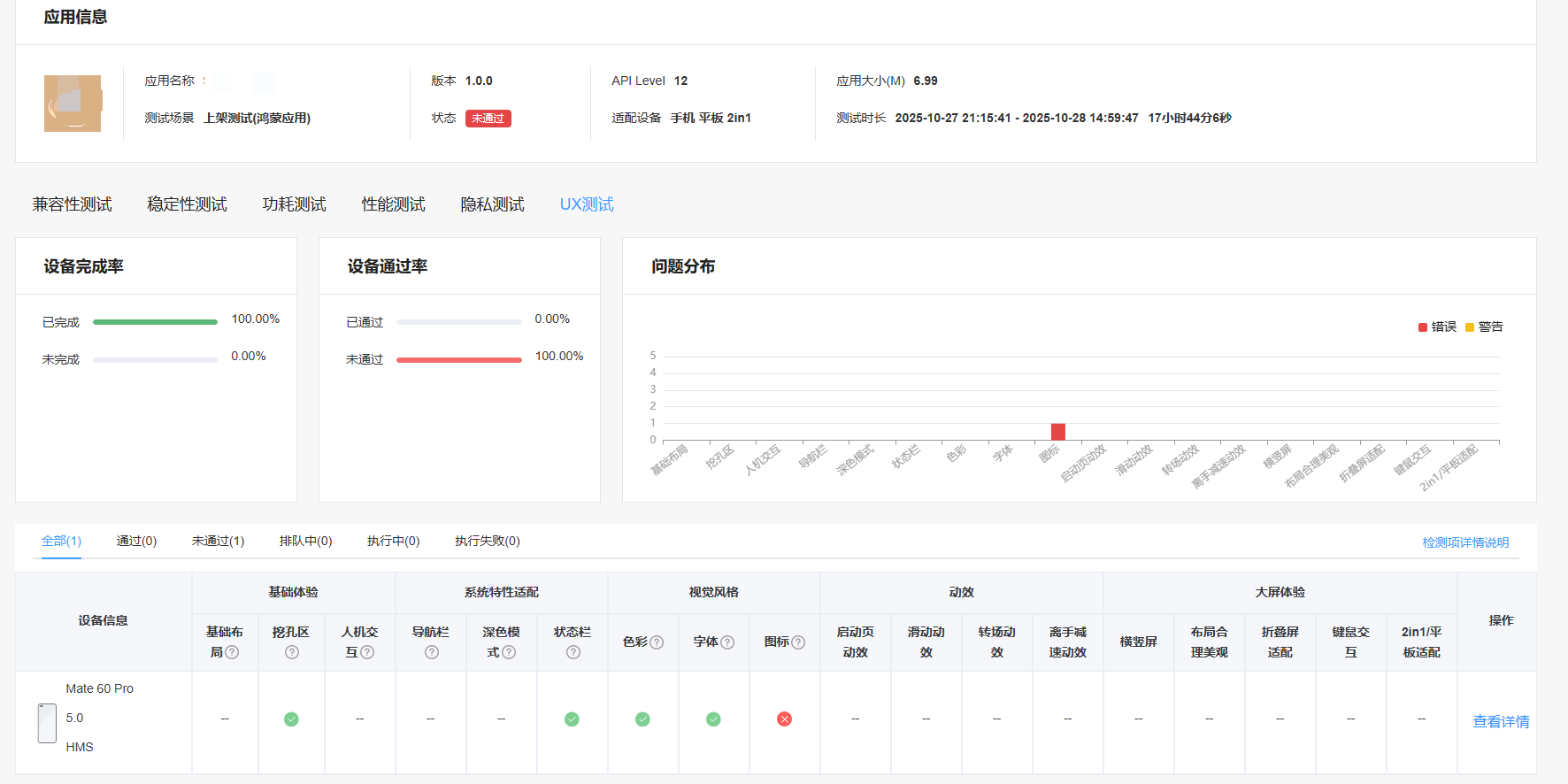 - 等待测试完成可以查看相关的测试报告,云测试的测试报告非常详细,可以根据测试中不通过的项目进行优化