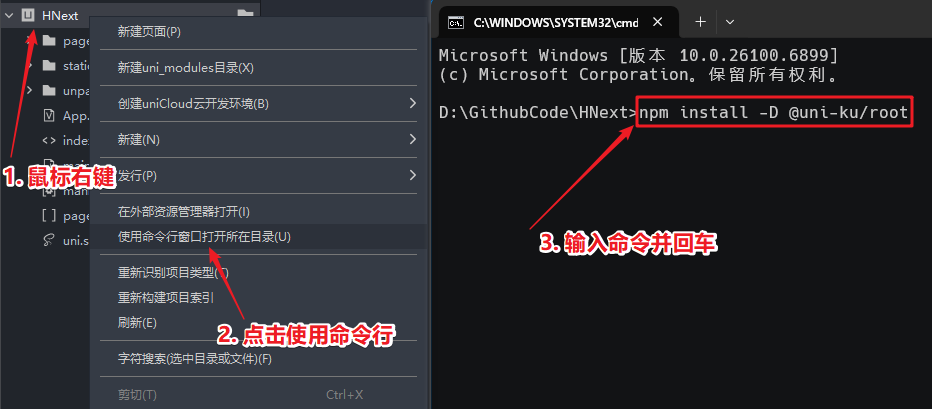 在我们的 HBuilder 中,选择我们的项目打开命令行窗口,输入命令
