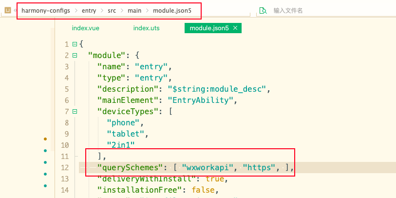 在 unpackage 里找到 app-harmony 工程产物文件,找到 entry/src/main/module.json5 赋值出来,放到 harmony-configs/entry/src/main/module.json5,添加 querySchemes