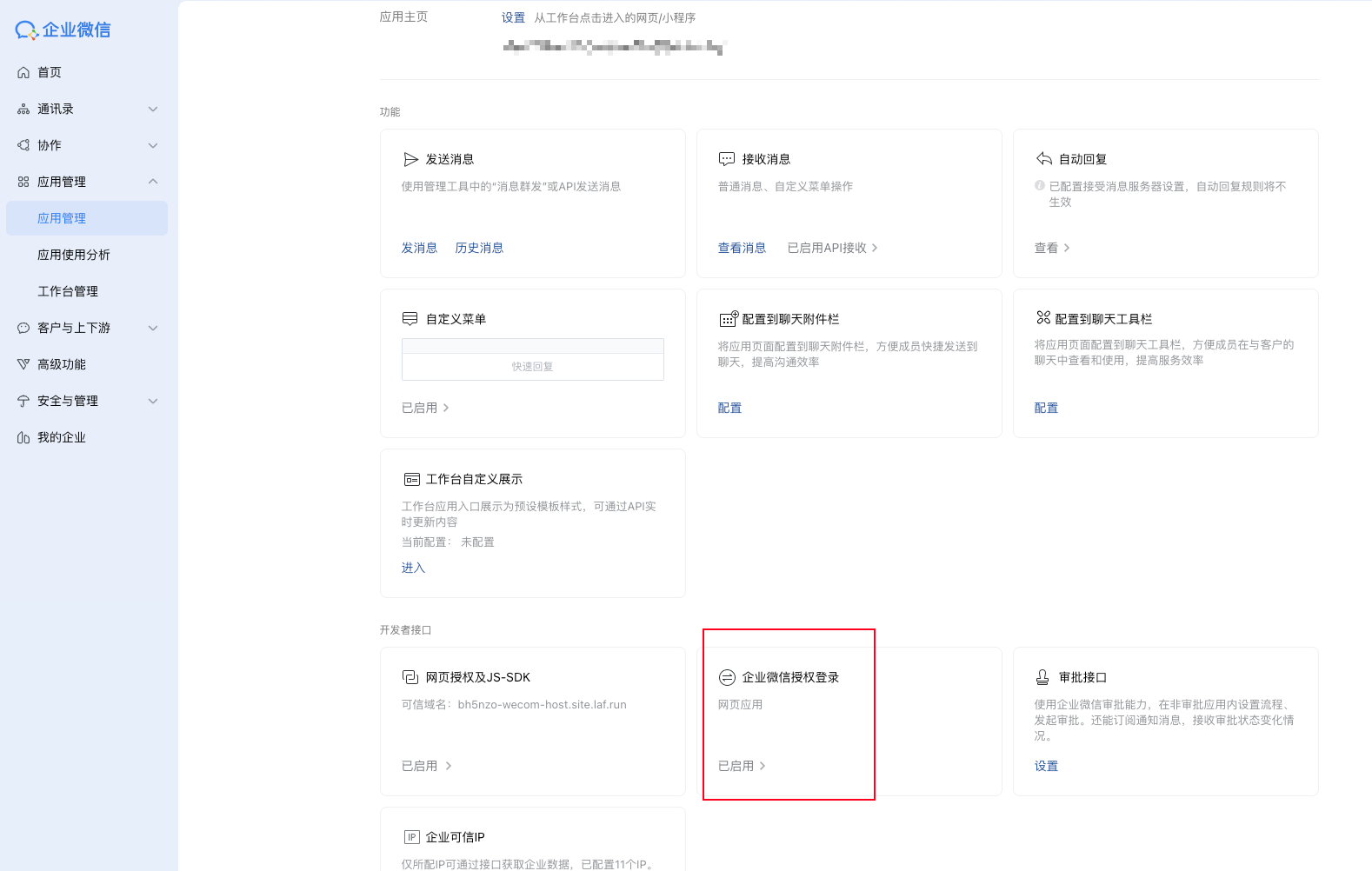 登录 企业微信的后台 ,提前创建好企业内部应用。然后找到应用管理,点击接入 企业微信授权登录