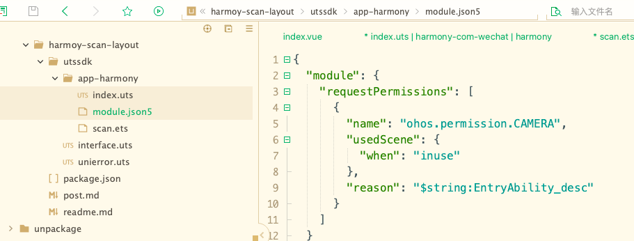 HBuilderX 中新建 uni api 插件,定位到 app-harmony 文件夹。新建 index.uts 和 scan.ets。