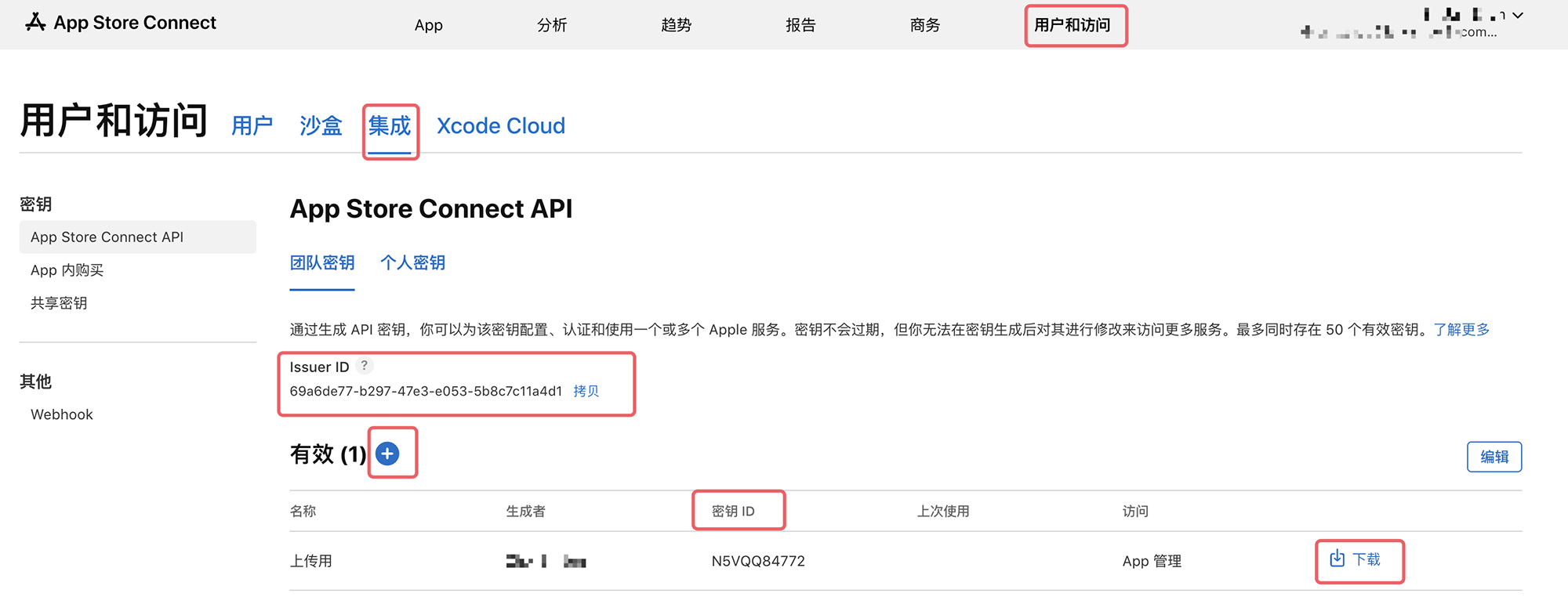 这样,注意,点击用户与访问菜单后,需要再点击“集成”标签,才能看到密钥设置页面。