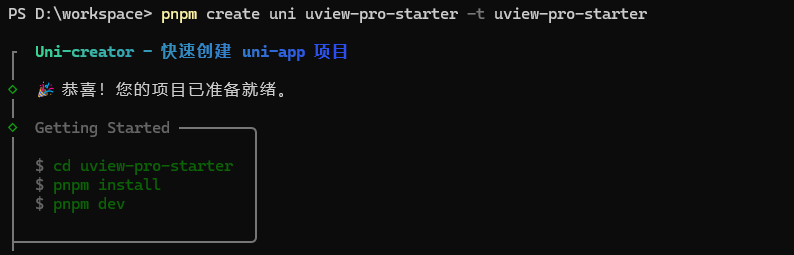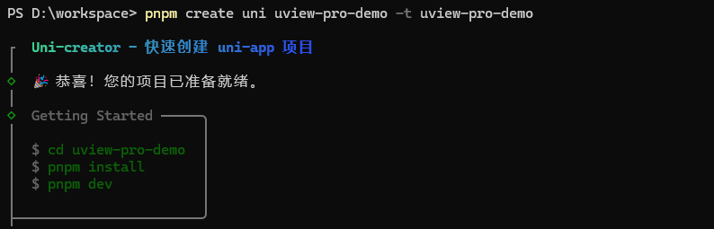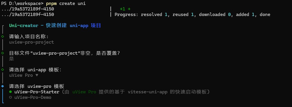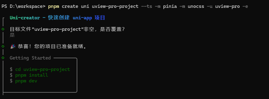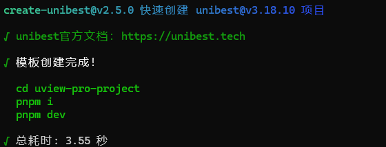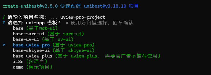 pnpm create uni <项目名称> --ts -m pinia -m unocss -u uview-pro -e