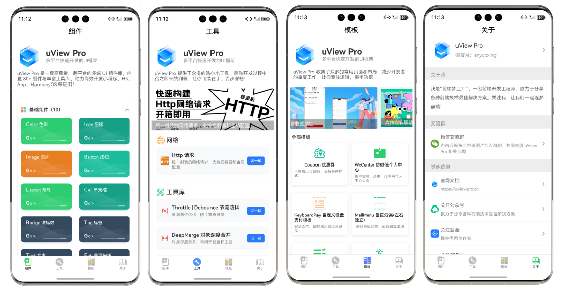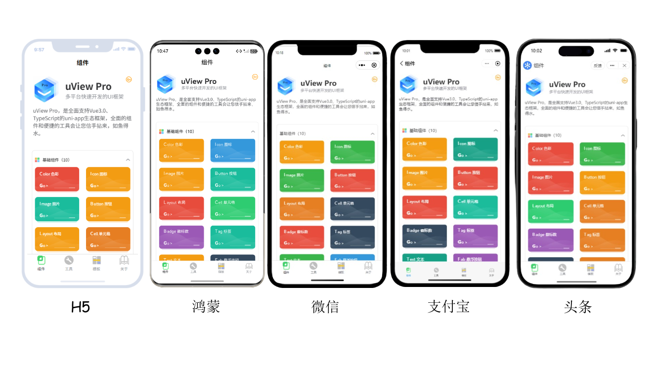 所以目前 uView Pro 在稳定性、功能性与跨平台兼容性方面已经有了良好的表现。主要实现了 APP、鸿蒙、微信、支付宝、头条等小程序平台的兼容,后续也会继续进行迭代。