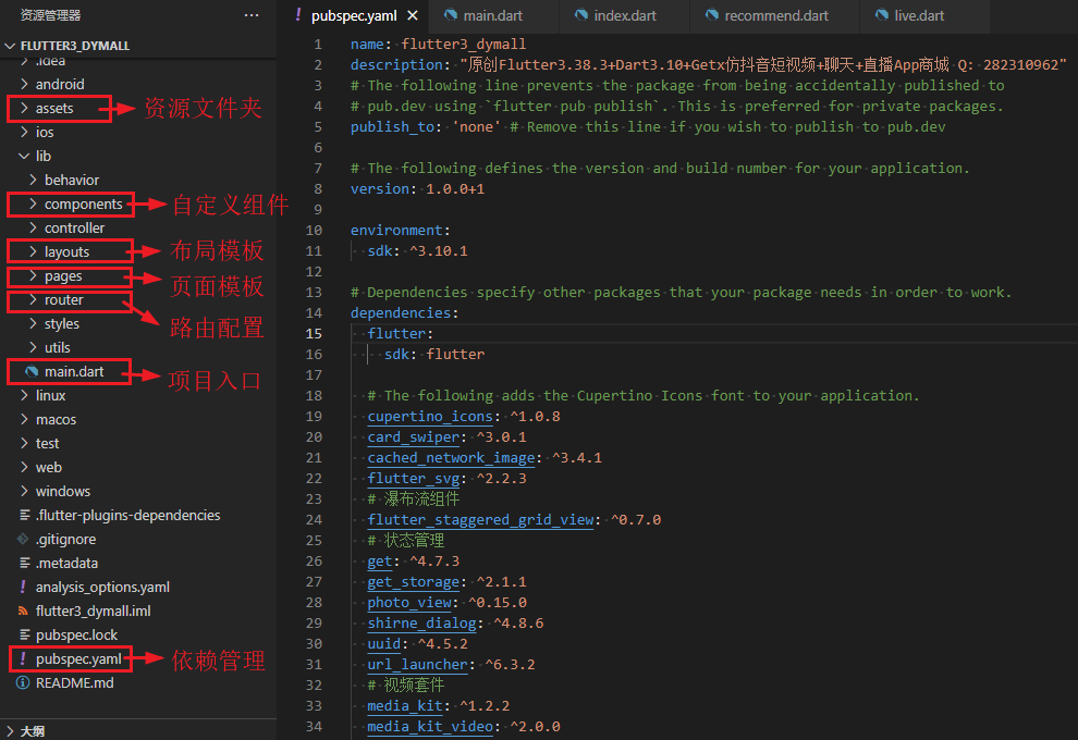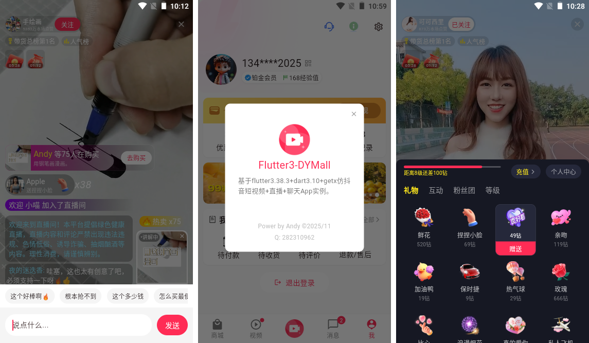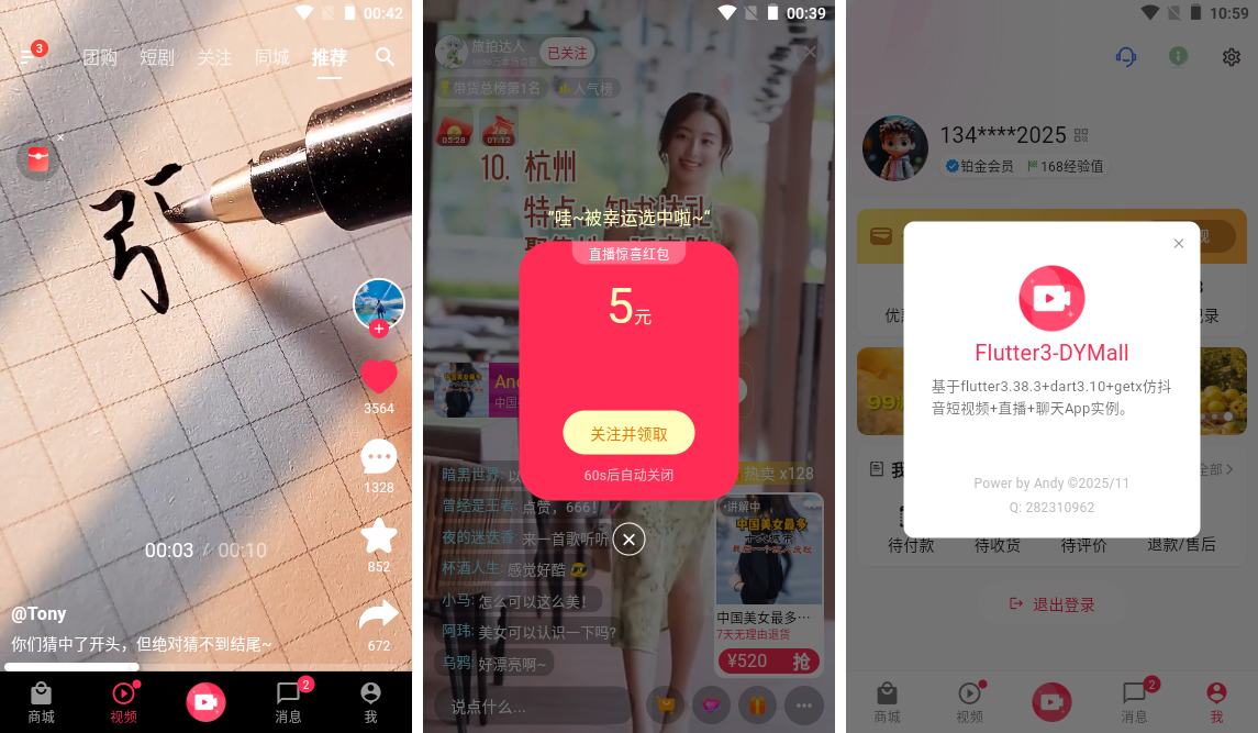 flutter3.38-dart-douyin:基于最新款跨平台flutter3.38.2+dart3.10+getx+media_kit实战仿抖音app界面短视频+直播+聊天app软件。实现抖音短视频页面上下滑动小视频/左右滑动页面模块、直播间进场/礼物侧边滑入动效。
