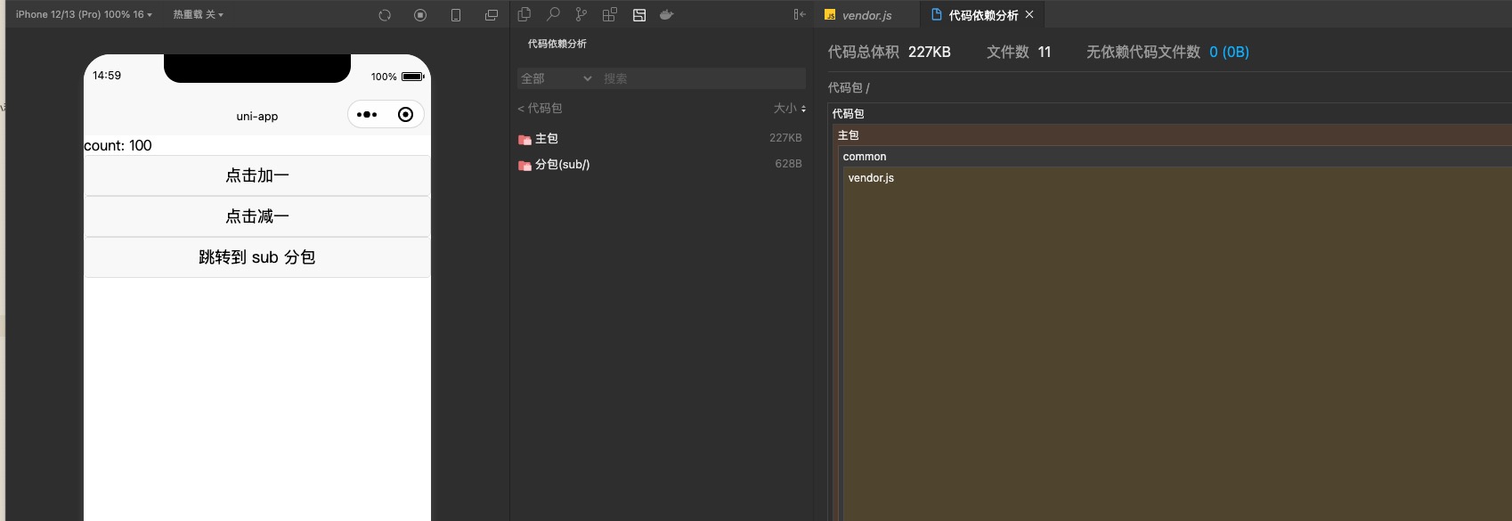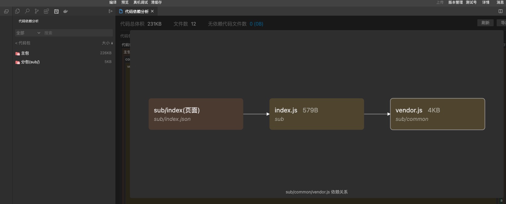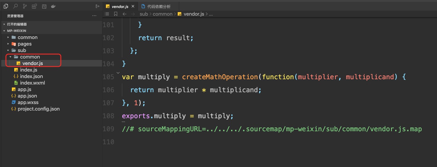 可以看到 分包 sub 根目录下面多了 vendor.js 文件,里面就是 lodash-es 的 multiply 函数,打包效果参考附件四和附件五