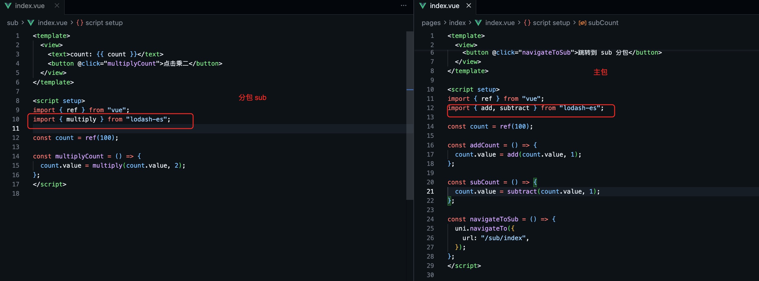 我们举一个简单的例子,主包用到了 lodash-es 的 add 和 subtract 函数,分包 sub 用到了 lodash-es 的 multiply 函数,这种分包用到的内容主包没用,就可以考虑使用这种策略,把 分包 sub 用到的 lodash-es 的 multiply 函数打包到 分包 sub 下,我们来看下 5.04 版本之前的效果
