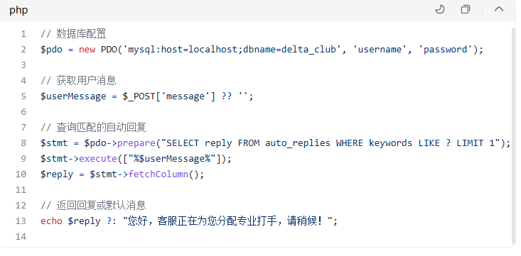 针对三角洲护航代练系统的客服自动回复,技术员可通过以下PHP代码修改逻辑,提升响应效率: