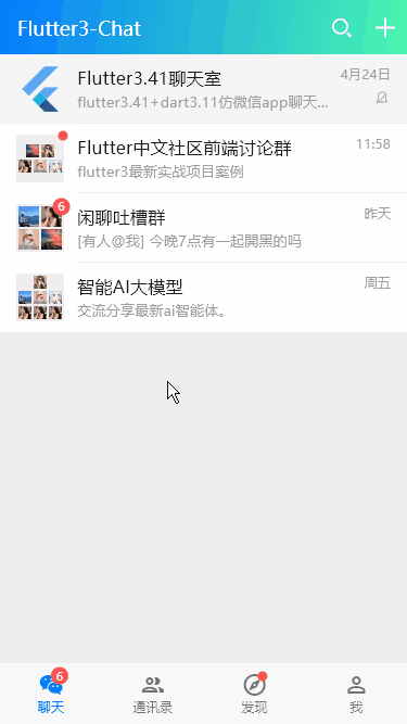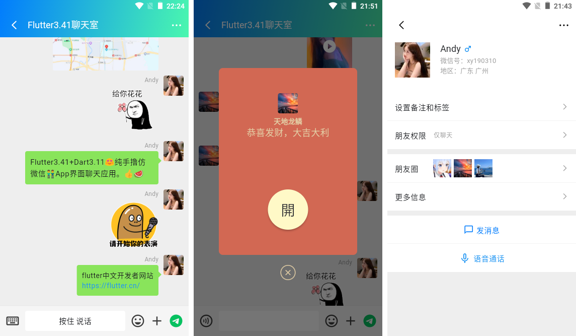 flutter3.41-chatroom:基于flutter3.41.5+dart3.11+get_storage+easy_refresh从0到1实战高质量仿微信聊天app界面聊天对话+气泡+朋友圈。原生交互?不过如此!这丝滑程度绝了,堪比原生app应用!