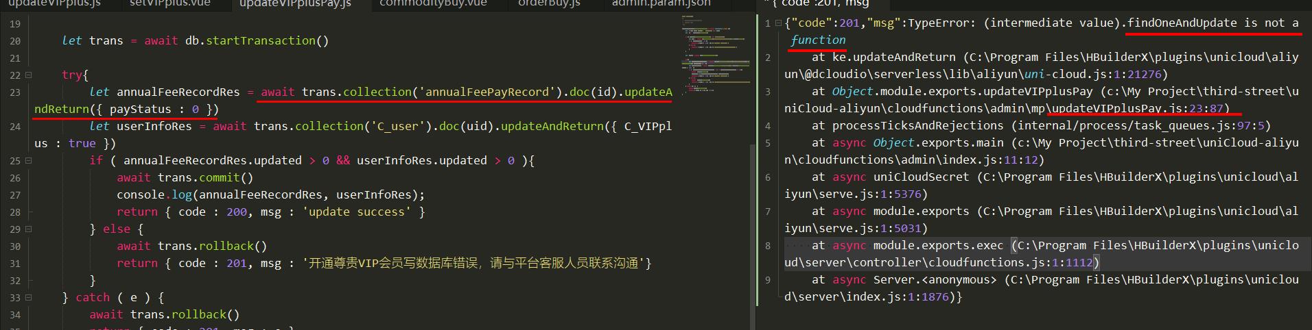 at Object.module.exports.updateVIPplusPay (c:\My Project\third-street\uniCloud-aliyun\cloudfunctions\admin\mp\updateVIPplusPay.js:23:87)