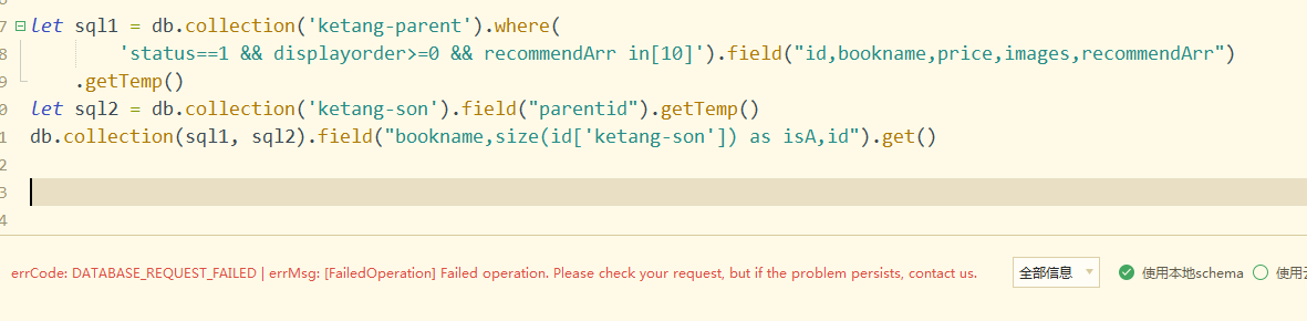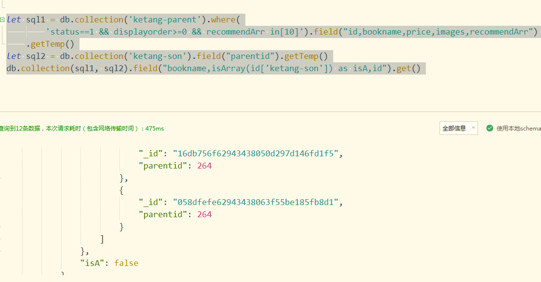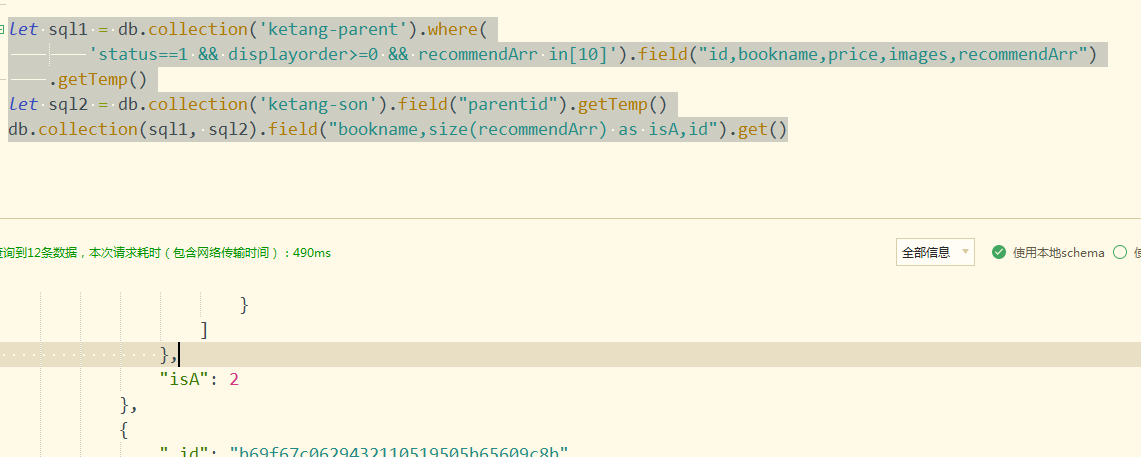 db.collection(sql1, sql2).field("bookname,isArray(id['ketang-son']) as isA,id").get()