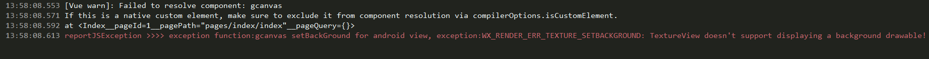 没有警告了, reportJSException >>>> exception function:gcanvas setBackGround for android view, exception:WX_RENDER_ERR_TEXTURE_SETBACKGROUND: TextureView doesn't support displaying a background drawable!这个错误还有