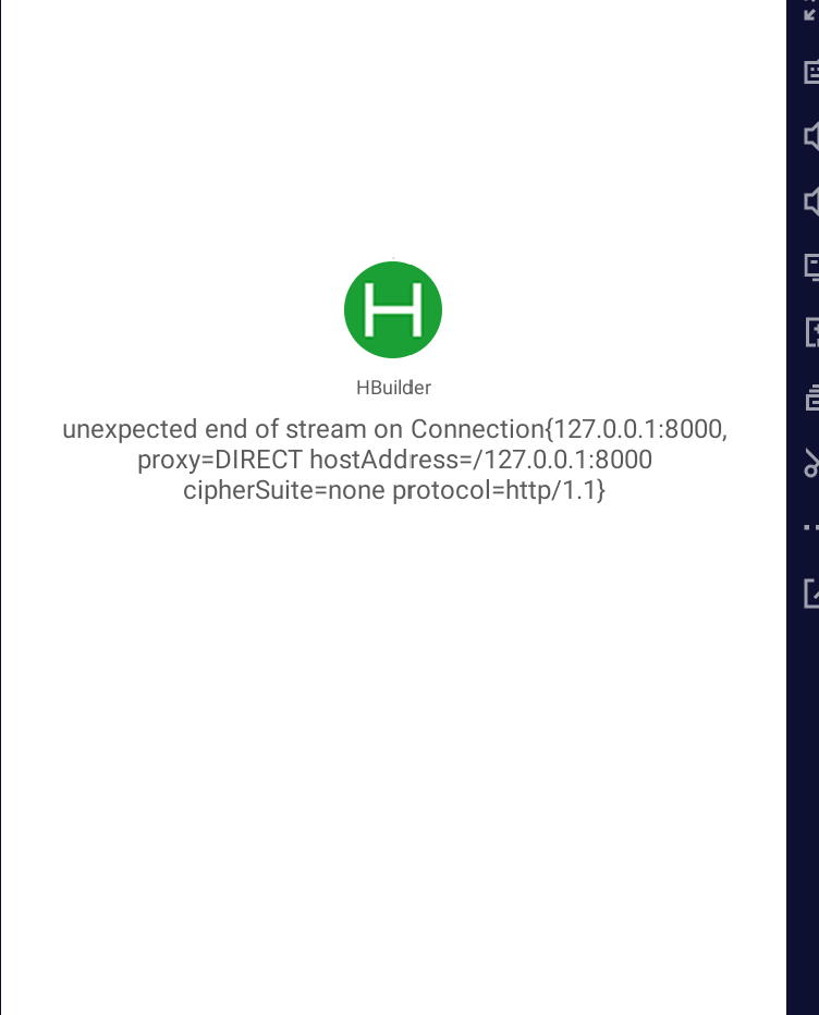 运行到夜神模拟器时要么白屏要么提示unexpected end of stream on connection{127.0.0.1:8000,proxy=DIRECT hostAddress=/127.0.0.1:8000 cipherSuite=none protocol=http/1.1,有大神遇到过么?