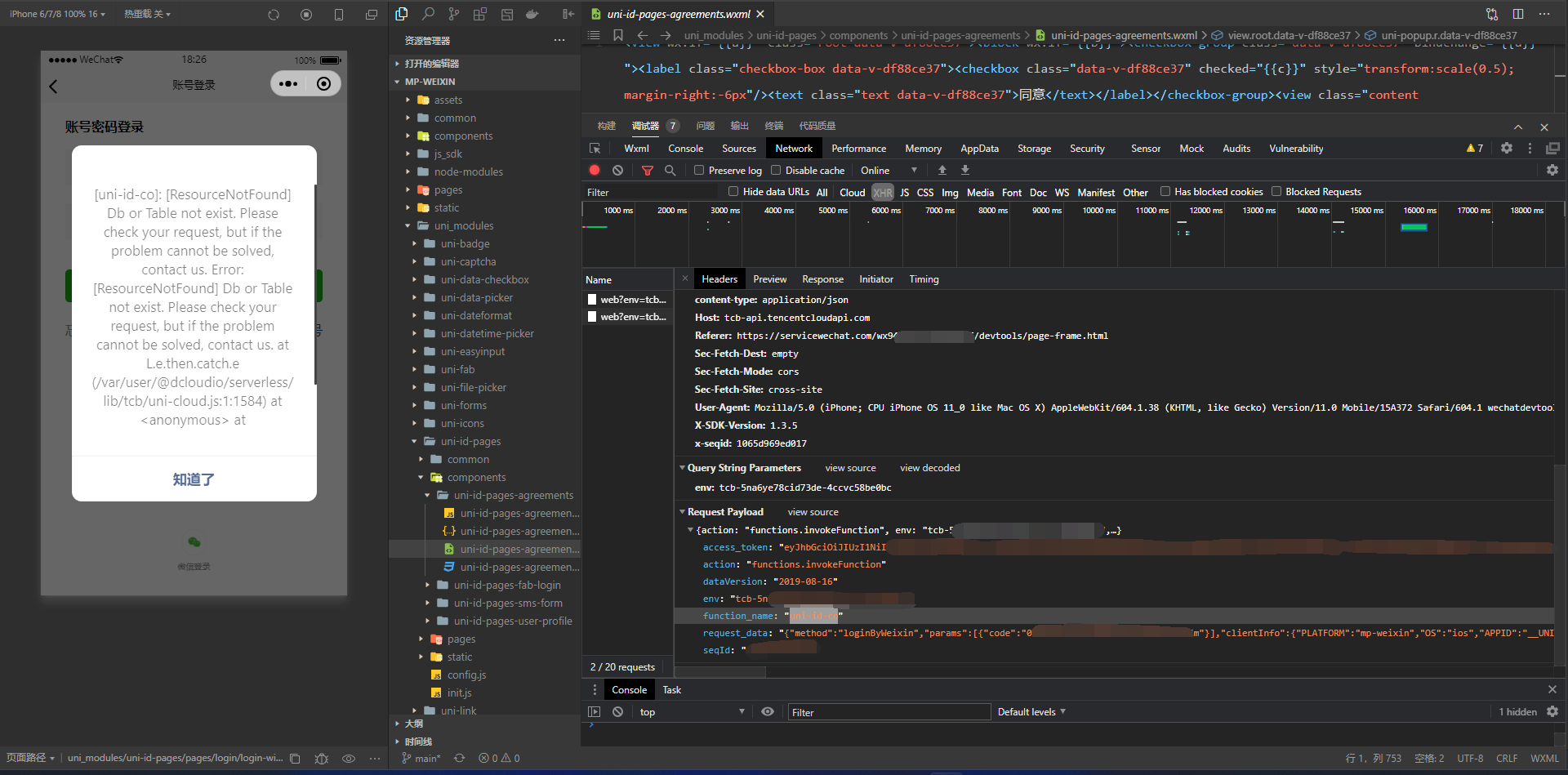 各位好,我是小程序初学者,在用uni-app做毕业设计。在HBuilderX创建的uniCloud项目并初始化云函数及其数据库后,遇到一个微信登录的问题:如图所示,当请求uni-id-co的loginByWeixin时提示数据库或表不存在,而如果我使用账号密码登录则是正常的。我目前尝试在已有的uni-id-co代码找数据库相关的操作,同时也想问问各位有没有遇到过此类情况或知道解决办法?