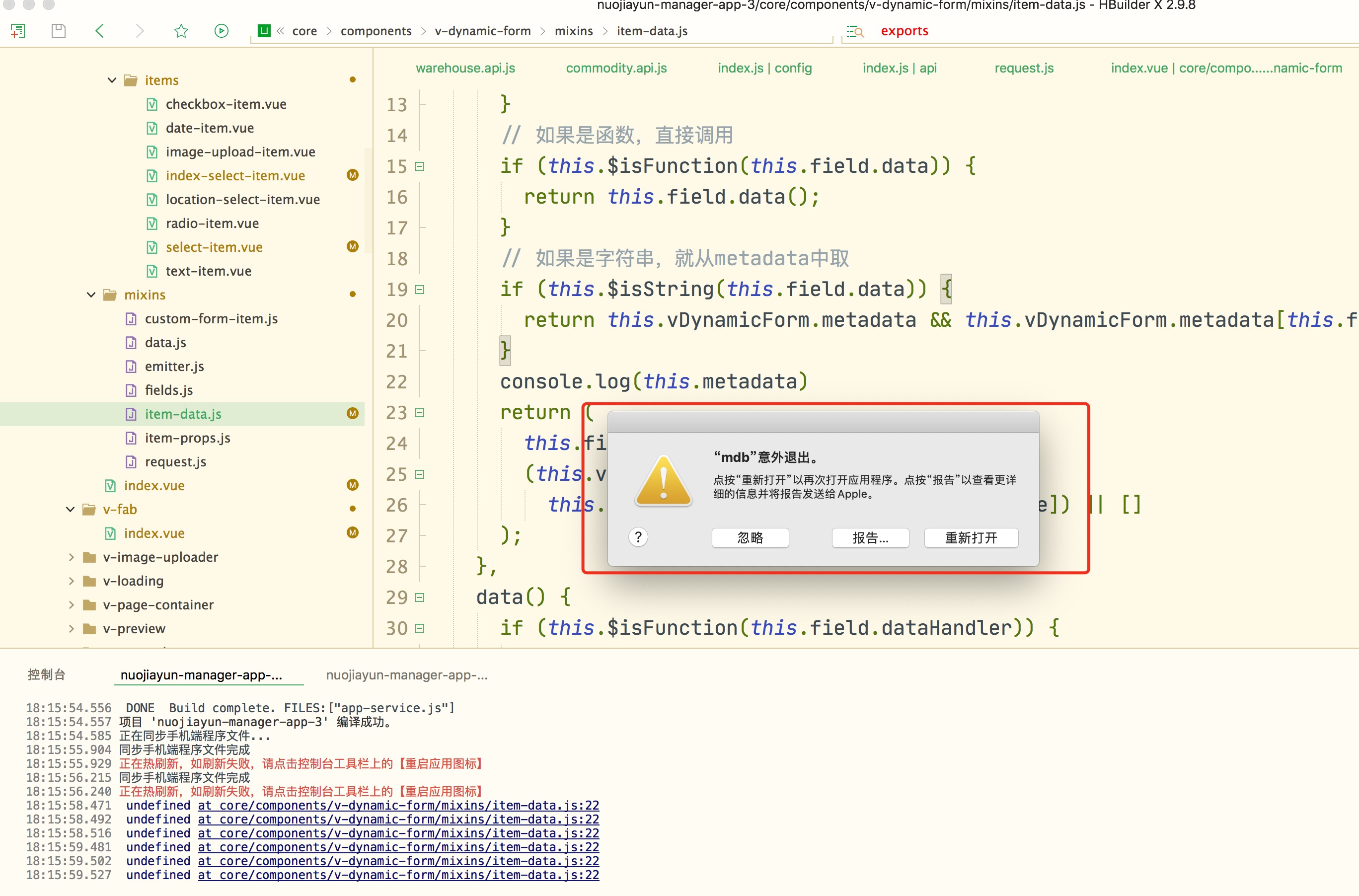 MacOS Catalina 10.15.7 HBuilderX 2.9.8.20201119 IOS真机自定义基座 有时候修改文件后Ctrl + S 保存一下就出现 mdb 意外退出问题,不算太频繁, 但还是挺频繁的。