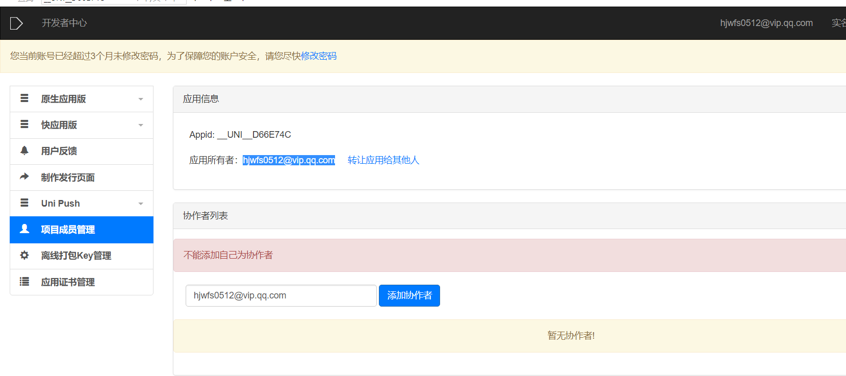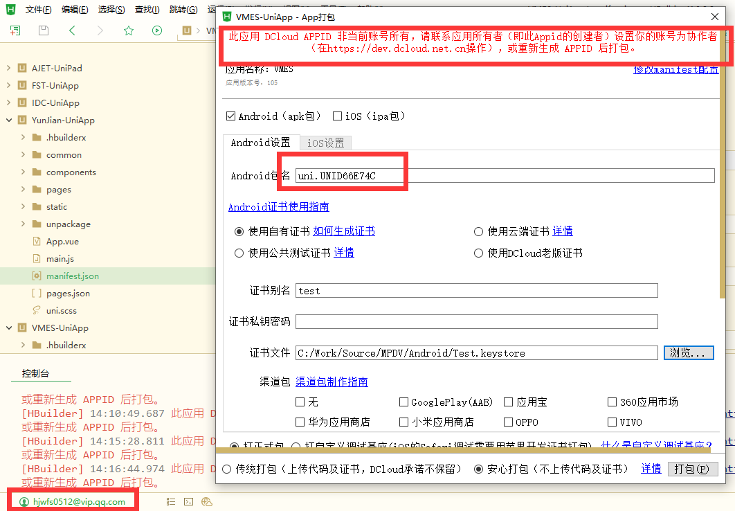 自己创建的app无法打包,HBuilderX登录的账号是创建应用的账号