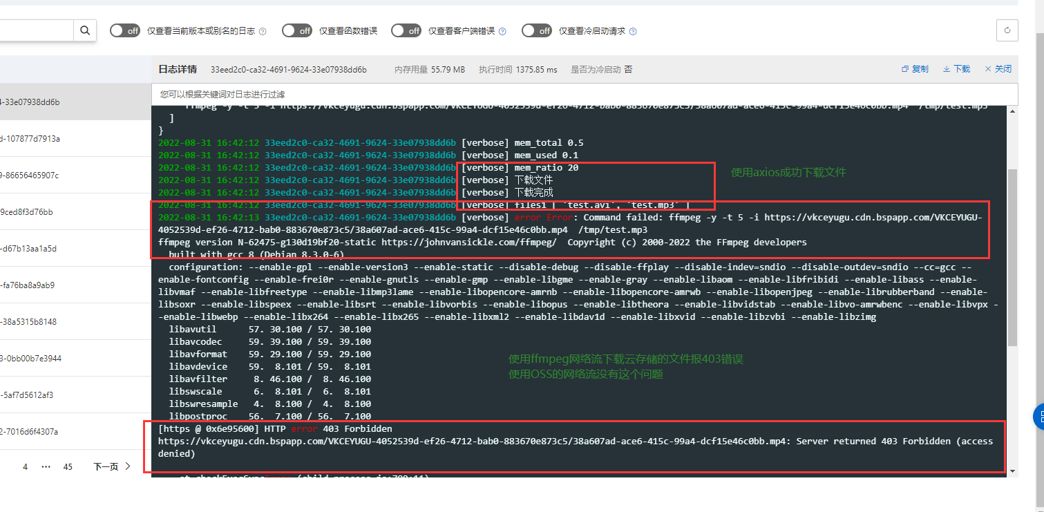 回复 DCloud_uniCloud_WYQ: 因为云存储没有请求日志,因此换为ffmpeg请求oss,返回的日志如下