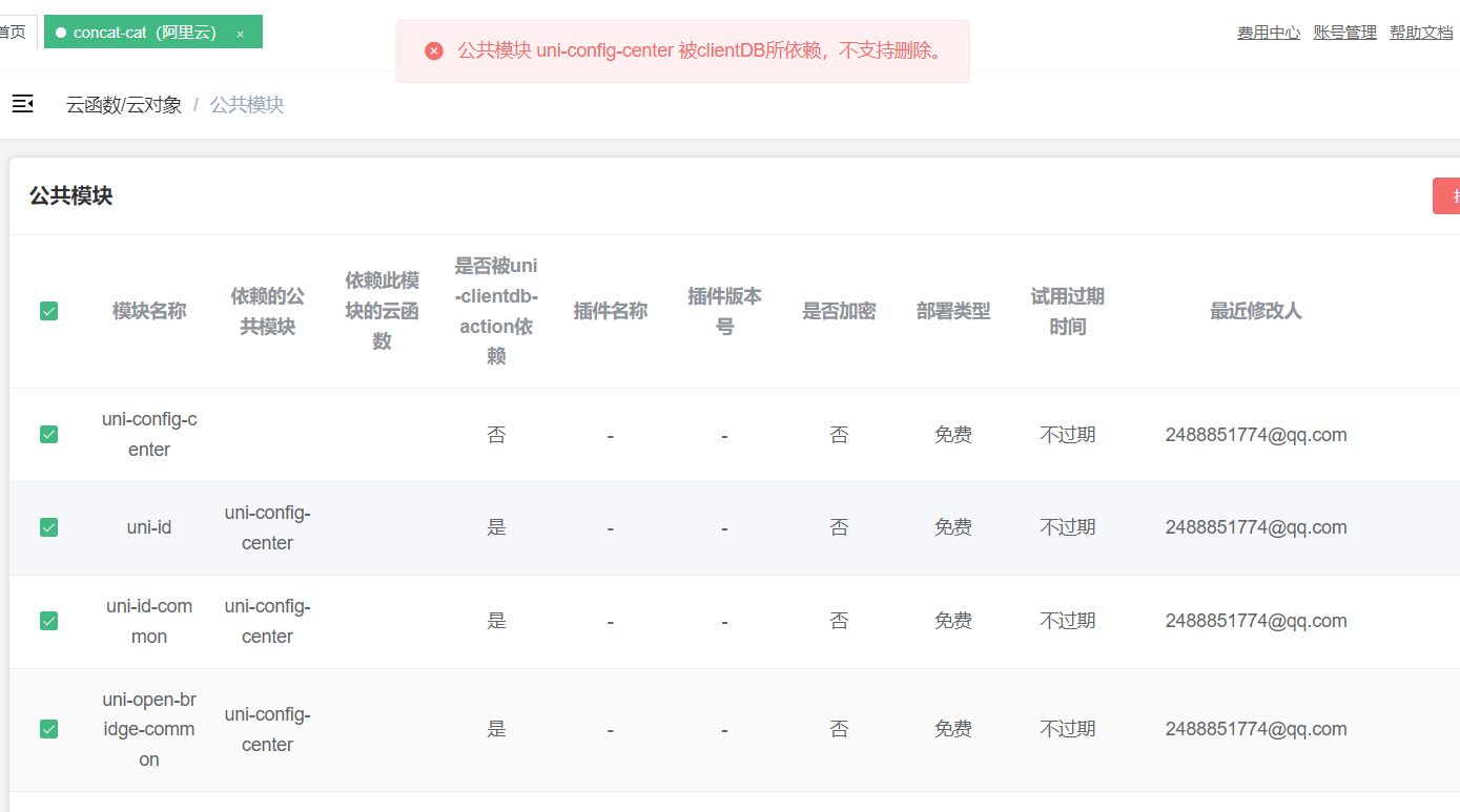 公共模块 uni-config-center 被clientDB所依赖,不支持删除