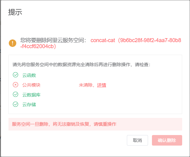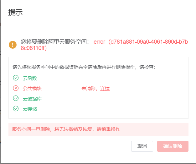 删除云服务空间的时候,提示需要删除公共模块,删除公共模块的时候提示: