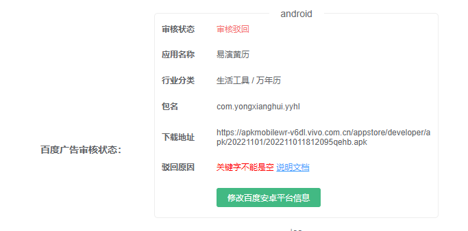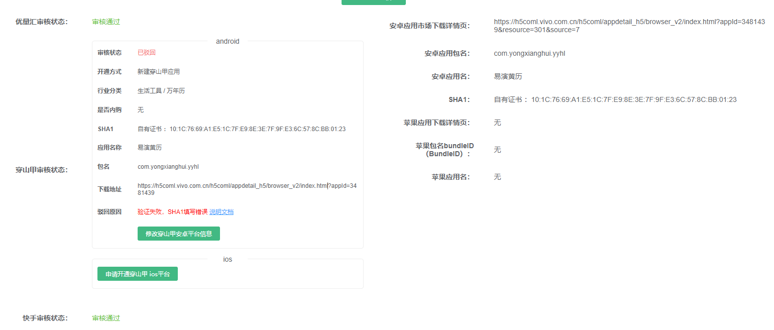 百度的好了,出来填版权信息了,但穿山甲那个还是有问题,SHA1明明没错,搞不懂为什么一直报这个错,我这个账号之前建的app都没问题,但这个就是一直报SHA1错误,提交了十多次都被拒,真不知道哪里的问题