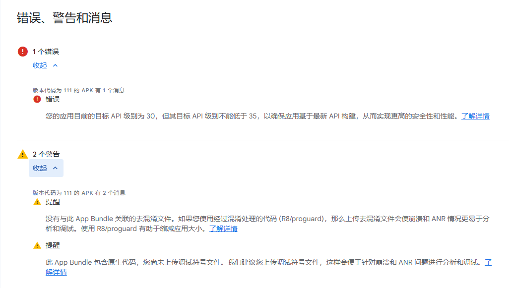 此 App Bundle 包含原生代码,您尚未上传调试符号文件。我们建议您上传调试符号文件,这样会便于针对崩溃和 ANR 问题进行分析和调试。了解详情