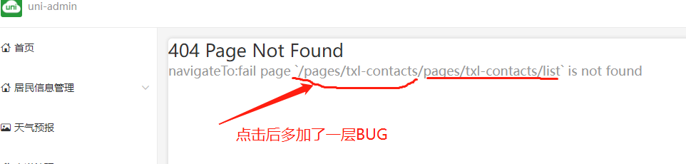 当你跳转页面时写 pages/home/home 这么写是相对路径, 最终页面路径变成了 /pages/index/pages/home/home
