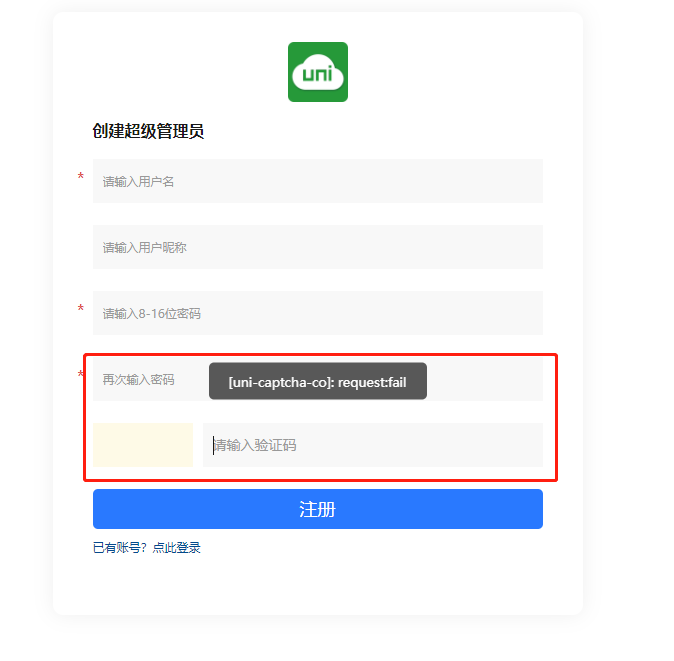 新申请的阿里云空间,在插件市场 一键部署UNI-ADMIN , 并在空间绑定自己的域名后。 第一次访问uni-admin 无法注册管理员账号。 验证码不显示。