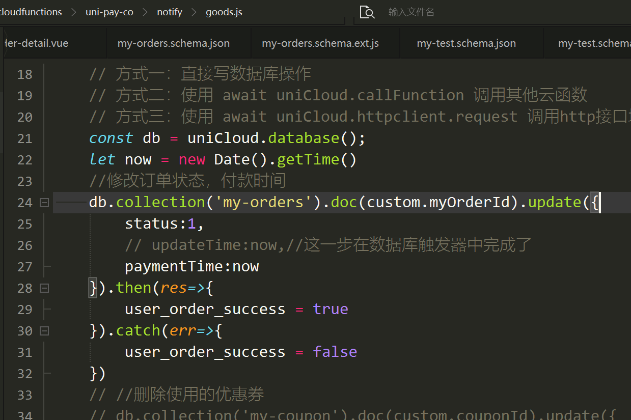 回调goods.js里如下,在数据库触发器ext.js里写了update_time的自动更新,在客户端更新数据库时可以触发,但是unipay的回调goods.js里更新数据库时却不能触发。