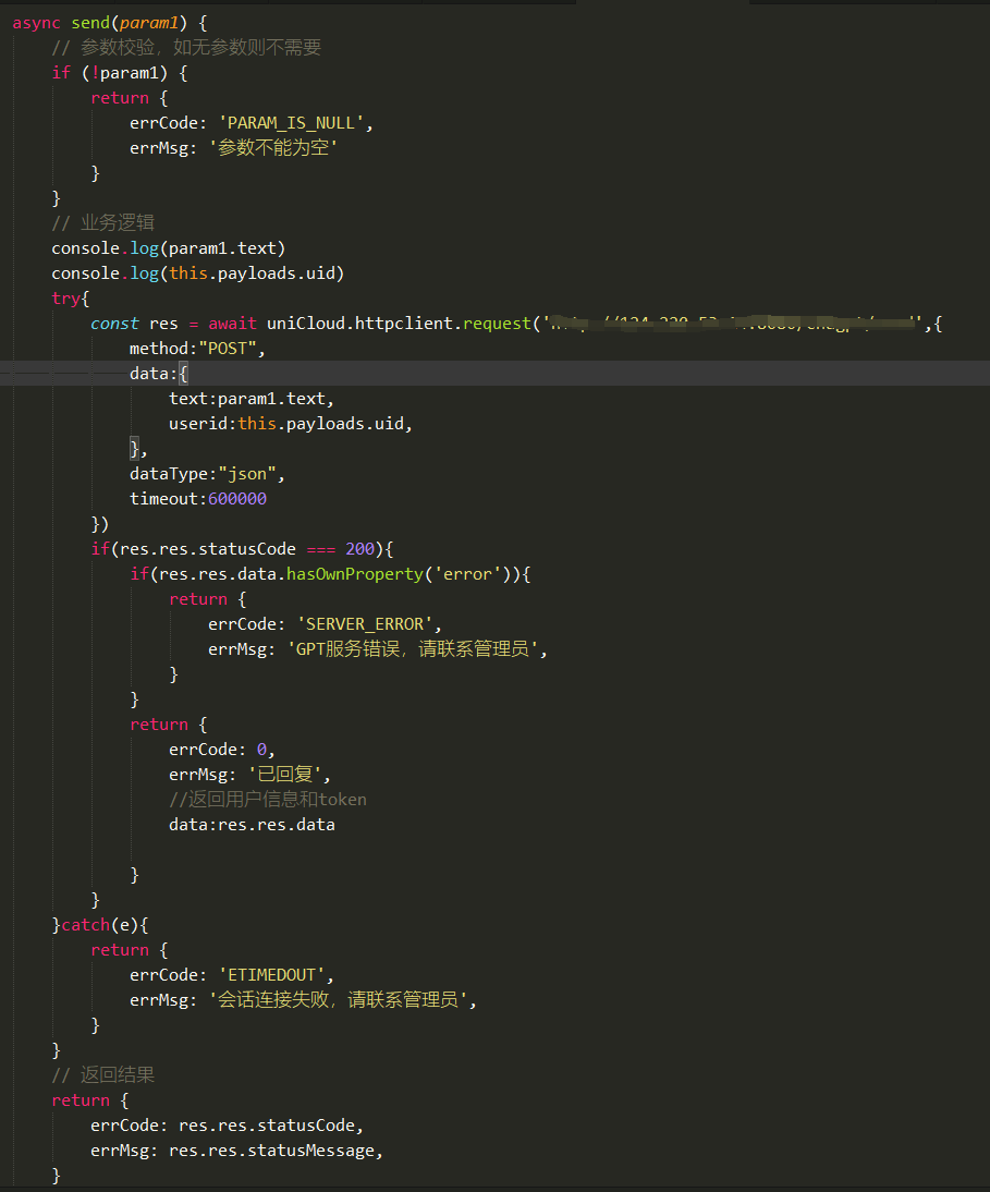 连接云端云函数使用调用此方法,走到请求的地方会直接返回 code: "FunctionBizError" httpStatus: 200 message: "" 查看日志运行显示运行状态异常,未报错。 使用本地云函数调用此方法一切正常;