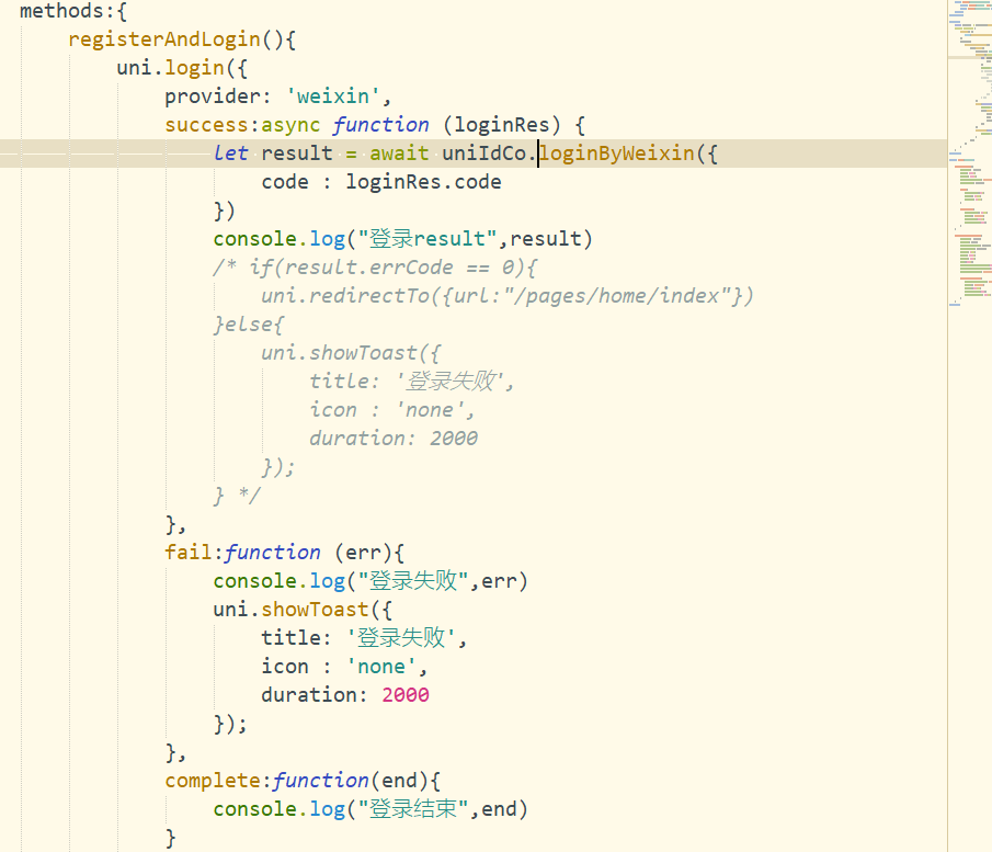 uni.login中success回调去掉async和await就可以进入success方法,加上的话不进入fail也不进入success,只会在complete回调中输出成功获取code,uni-admin项目中用户日志里边也没有登录的日志