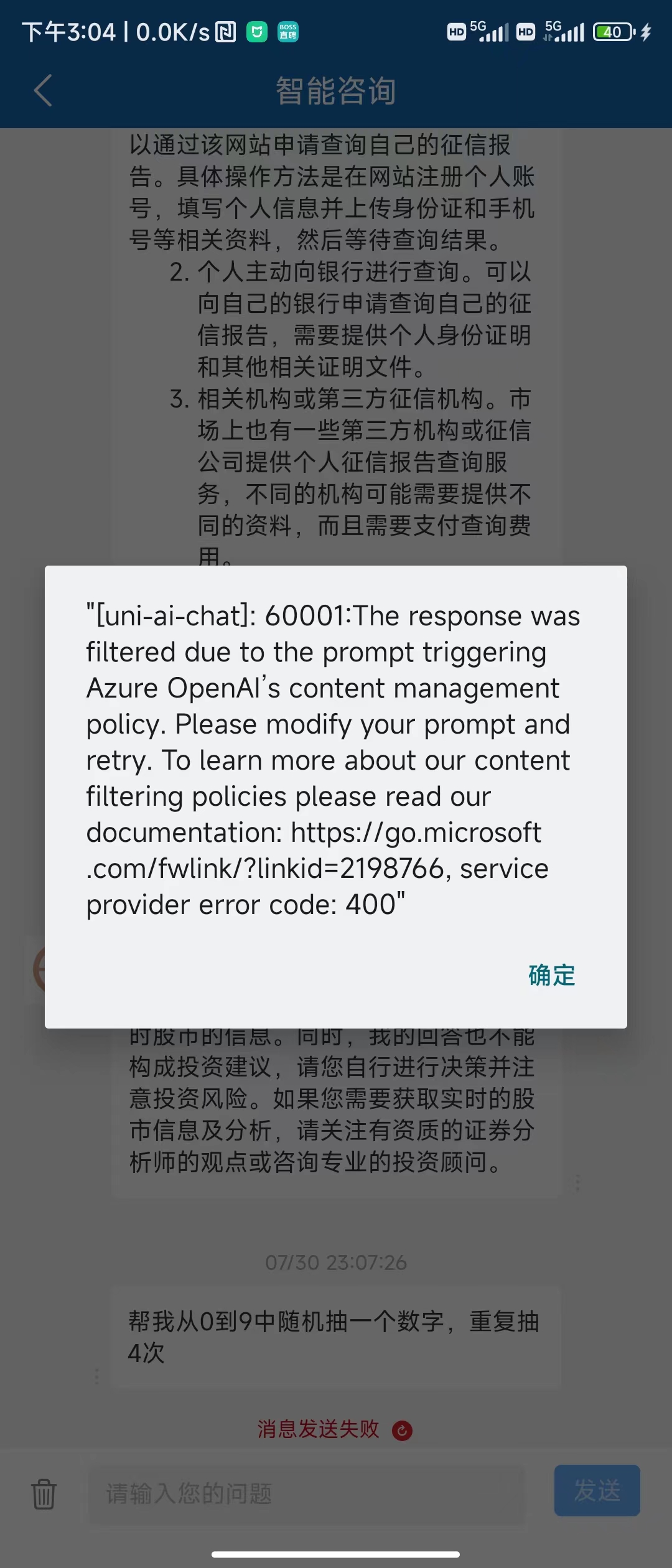 输入或前文被微软的安全校验判定为违规内容了。这种情况一般应该清除前文和输入,让用户重新问。这个60001错误码是不对的,你更新一下HBuilderX看看是不是就提醒60004错误码了。60004错误码uni-ai-chat会自动处理