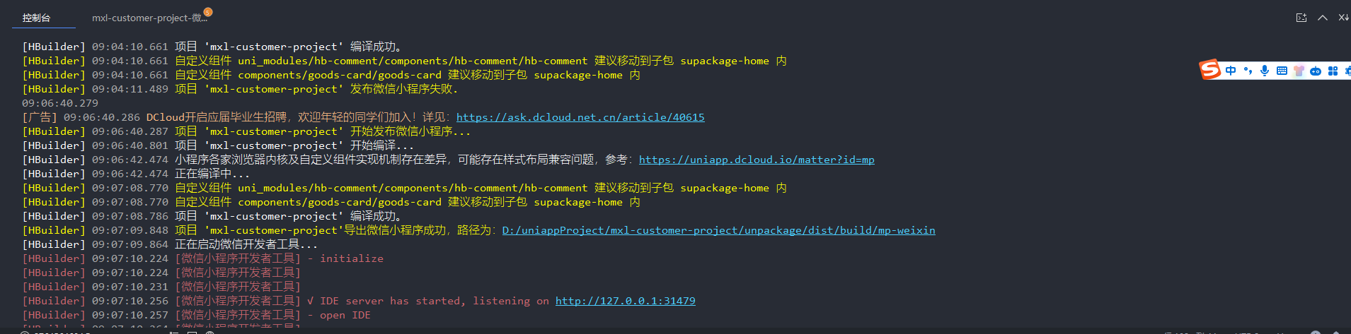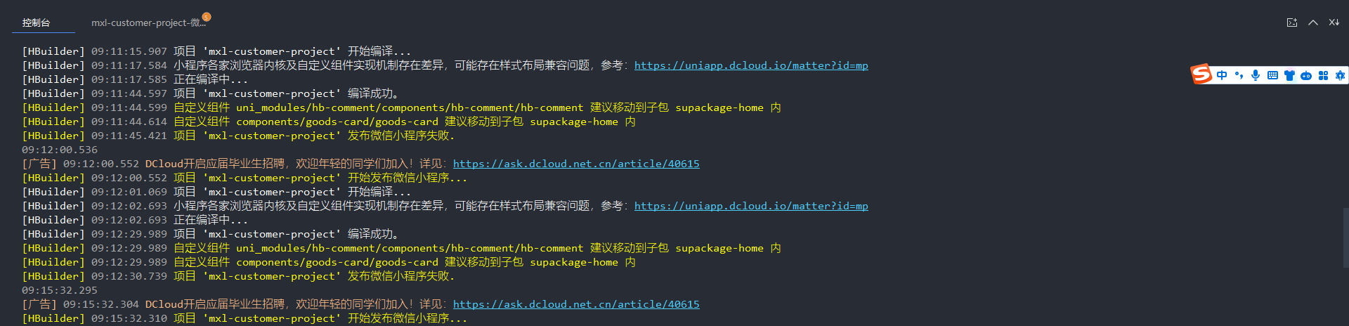 开发完一个公司代码时,点击发行为微信小程序时有时候失败,小程序appid为公司的,换成自己的可以成功,用公司的概率性成功