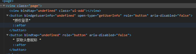 <view class="ui-add" bindtap="{{a}}"></view><button open-type="getUserInfo" bindgetuserinfo="{{b}}" withCredentials="true">授权登录</button><button bindtap="{{c}}"> 获取头像昵称 </button>