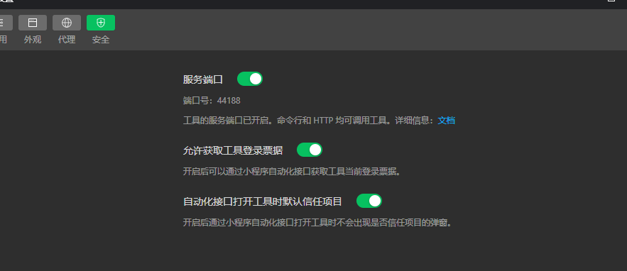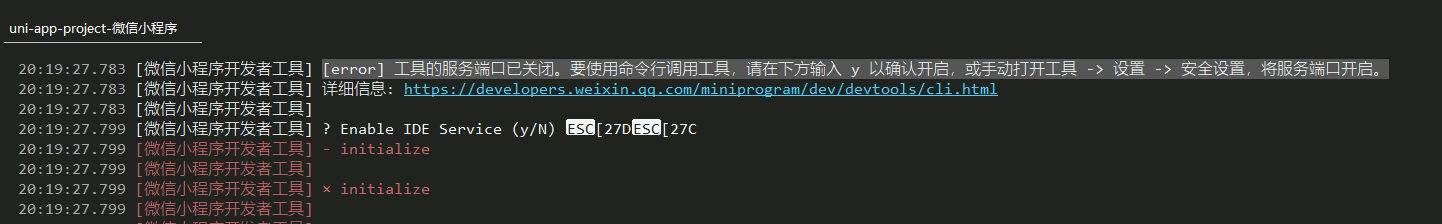 [error] 工具的服务端口已关闭。要使用命令行调用工具,请在下方输入 y 以确认开启,或手动打开工具 -> 设置 -> 安全设置,将服务端口开启。