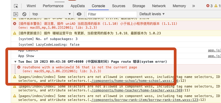 打开小程序模拟器后出现:routeDone with a webviewId 56 that is not the current page(env: macOS,mp,1.06.2312061; lib: 3.2.3)