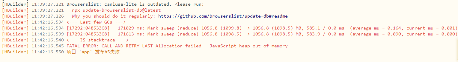 [HBuilder] 11:42:16.545 FATAL ERROR: CALL_AND_RETRY_LAST Allocation failed - JavaScript heap out of memory