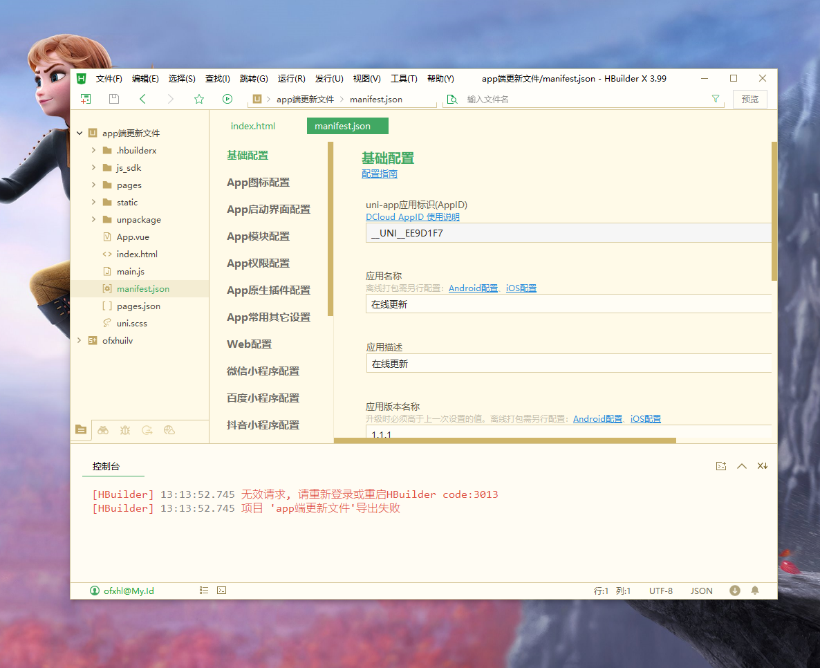 打包制作wgt包报: [HBuilder] 15:11:25.250 无效请求, 请重新登录或重启HBuilder code:3013 [HBuilder] 15:11:25.278 项目 'w'导出失败 有遇到同样问题的吗?望有懂的帮忙解惑一下,谢谢!